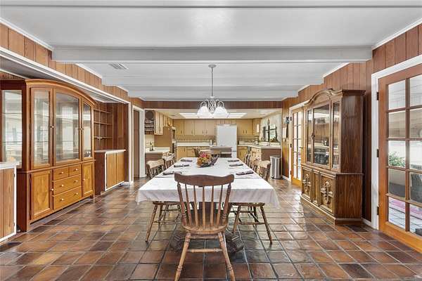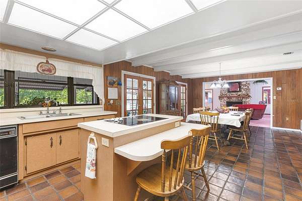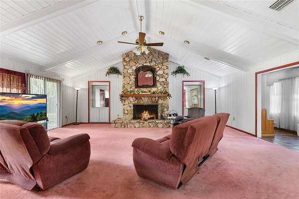 Inside, the OPEN-CONCEPT floor plan features a spacious living room with a stunning stone FIREPLACE, CATHEDRAL WOODEN CEILING and two sets of sliding glass doors that fill the space with natural light while providing picturesque views of the pond. The dining area overlooks the living room, creating a seamless space for entertaining or relaxing.