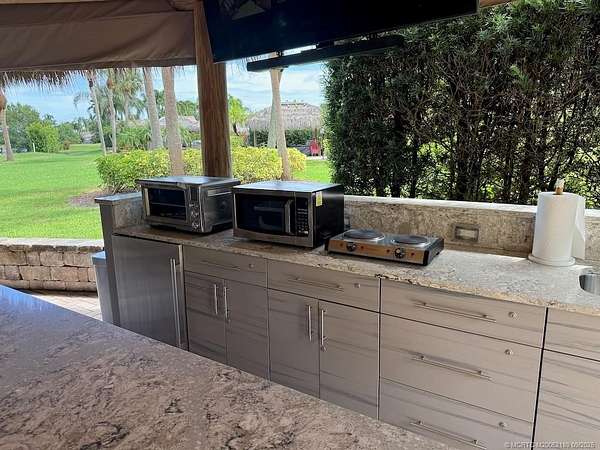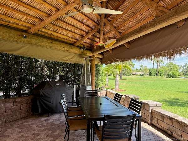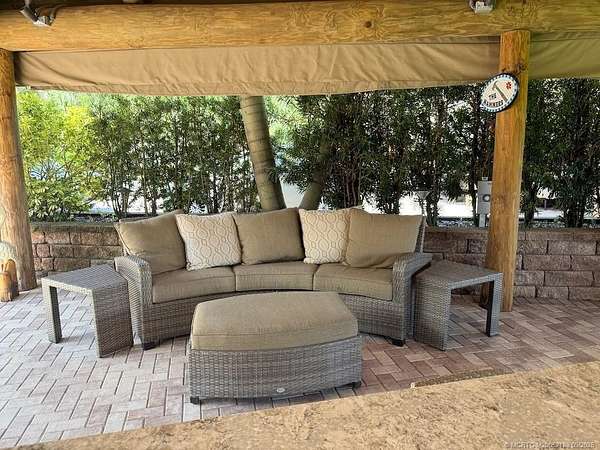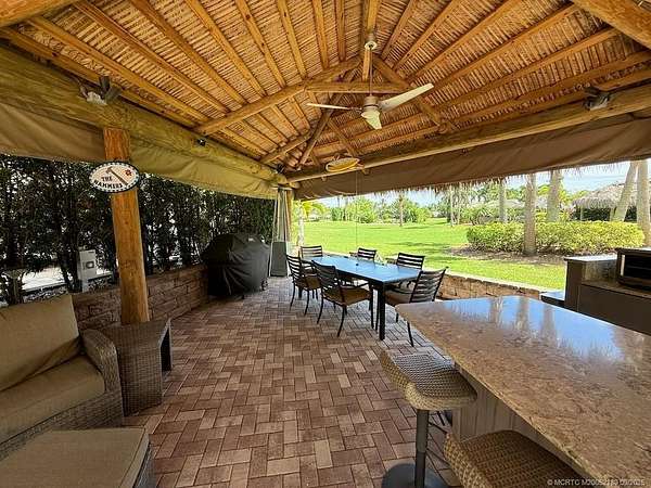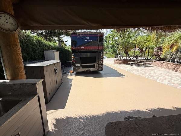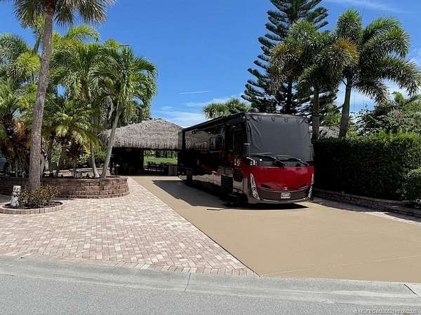 This stunning lot offers the perfect combination of beauty, function, and lifestyle. Surrounded by mature tropical landscaping and overlooking peaceful green space and ponds with sparkling fountains, this property is as scenic as it is serene. With 56 feet of frontage, there's ample room for your coach, vehicle, and even a dedicated golf cart parking area. The expansive tiki, built in 2020 and freshly re-thatched in 2023, provides the ultimate outdoor living space. Inside, you'll find a marine-grade kitchen with granite countertops, a spacious island with pop-up electrical outlets, and a drop-down TV-ideal for hosting football Sundays or dinner parties with friends. Evenings are magical with professional landscape lighting that illuminates the lush palms and highlights the property's tropical charm. Best of all, it's being sold fully furnished-just bring your coach and start enjoying resort-style living right away. An absolute beauty-designed for relaxing days and unforgettable nights.