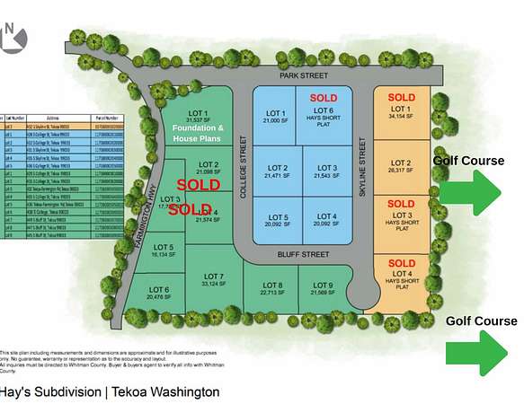 Golf Course Subdivision - Rare Large Lots in Hay's Subdivision, Tekoa WA! Now offering 12 generously sized lots in Hay's Subdivision-with easment access to Tekoa Golf Course and only 2 miles to Willard Airport. Parcels views and amenities vary by lot. Sold as individual lots or all together. Some lots include paved road access and city water/sewer, see plat map. Block 3 lot 1 includes foundation and house building plans. Light CCR's and No HOA fees. Recorded plat map & survey pins. Enjoy the perfect blend of recreation and relaxation with a quick golf cart ride to the course and access to ATV trails just 15 minutes away. Located in the charming town of Tekoa, you'll find all the essentials: grocery store, schools, restaurants, library, pharmacy, hardware store, parks, pool, bank, theater, golf course, coffee shops, Palouse to Cascade Trailhead / Trestle, and more. Embrace the charm of small-town living while still enjoying modern conveniences.