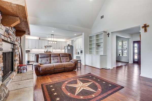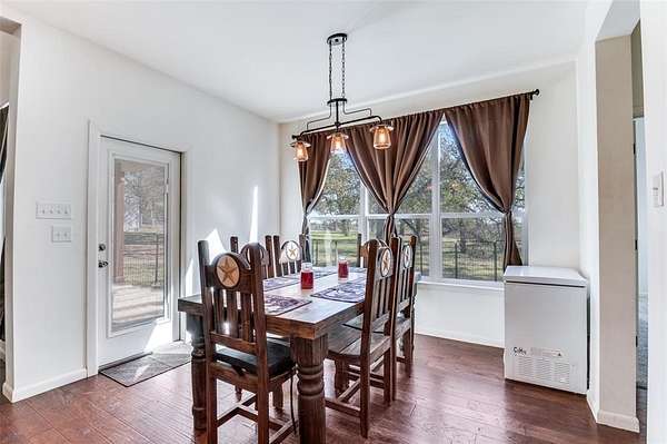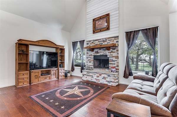 Welcome home to this stunning modern farmhouse, perfectly positioned on a serene 2-acre country paradise. This thoughtfully designed home blends timeless charm with contemporary comfort. From the moment you arrive, the expansive front porch invites you to slow down and stay awhile. Step inside to an impressive open-concept floor plan highlighted by rich hardwood floors, custom built-ins, and modern decorative lighting throughout. The vaulted living room ceilings and massive picture windows flood the space with natural light, while a custom wood-burning fireplace anchors the room with warmth and character. The spacious eat-in kitchen, seamlessly connects to the living area--perfect for everyday living and entertaining alike. Enjoy stainless steel appliances, granite countertops, and a large center island with seating. Retreat to the private primary suite featuring a jetted soaking tub, oversized walk-in shower, separate vanities with quartz countertops, and a generous walk-in closet. Step outside to the covered back porch and take in the peaceful surroundings--mature trees, open skies, and tranquil views of the adjacent pond create a true country escape. Completing the property is a 20x30 metal workshop storage building, ideal for hobbies, tools, or all your recreational toys. This exceptional modern farmhouse offers the perfect blend of comfort, craftsmanship, and countryside living--an opportunity not to be missed.