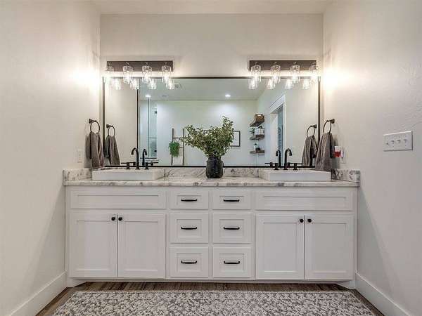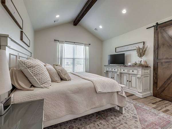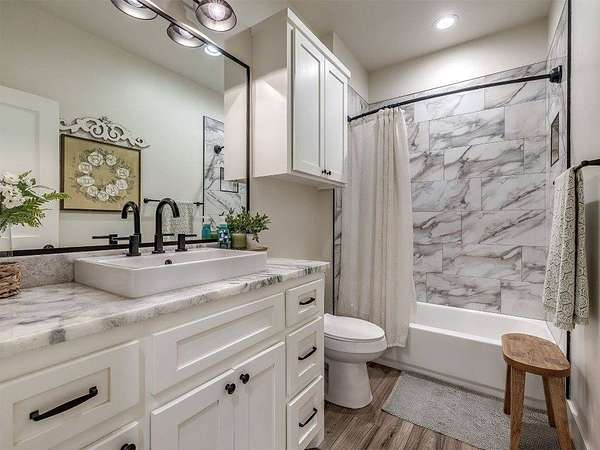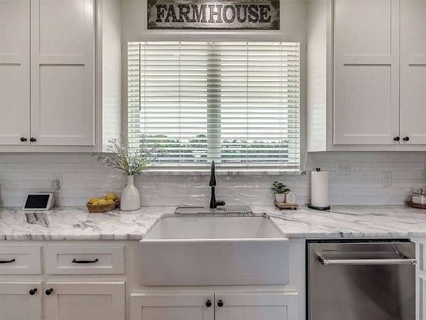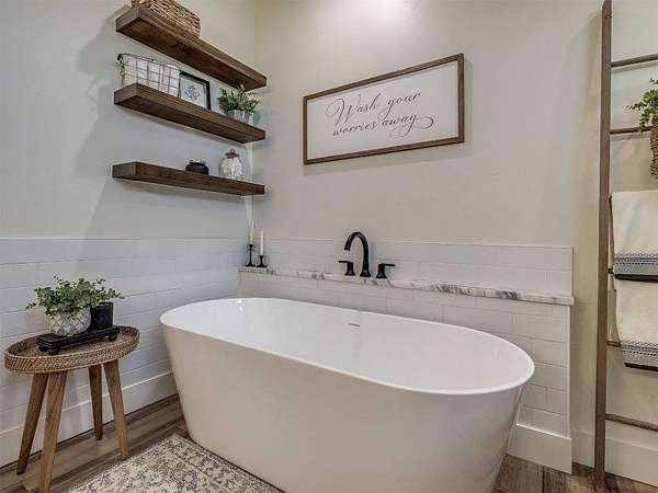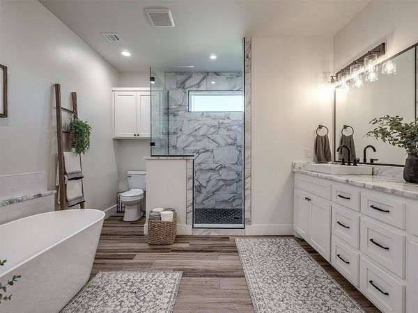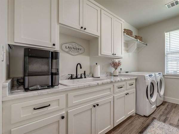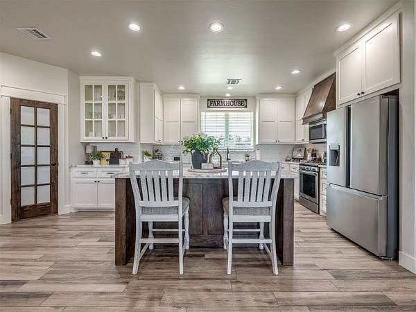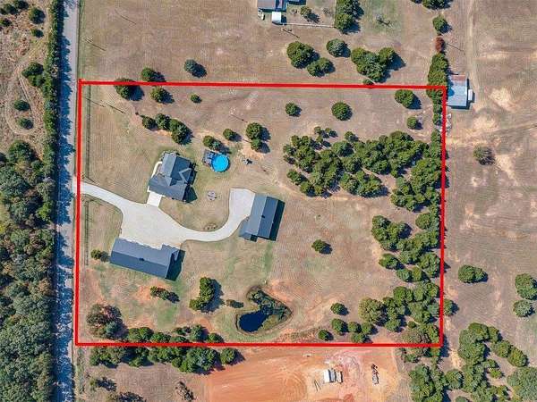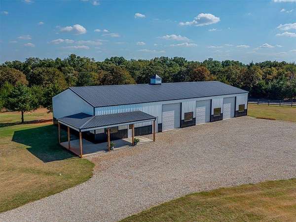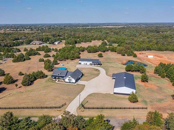 Modern 2022 home on 6.66 acres with 2 large shops, pool, pond, and guest quarters. Discover a rare blend of luxury and utility in Shawnee, located in the sought-after Grove School District. This 3-bed, 2-bath home offers 2,159 sq ft of open-concept living with a covered patio and high-end finishes throughout, including 3cm leathered marble countertops in the kitchen and baths. The professionally landscaped acreage features a serene pond, custom firepit, and an above-ground pool perfectly positioned for both sun and privacy. Enjoy the peaceful, rural feel while still being conveniently close to town, shopping, and I-40 access. The property includes two premium shops: Shop 1 is 45x100' with 14' sidewalls, three 10x12' insulated garage doors, and plumbing stubbed into the slab for a future bathroom. Shop 2 is 40x70', fully insulated with two 8x10' overhead doors and includes a 40x50' workspace plus a 20x40' fully finished guest quarters with granite kitchen, full bath, laundry, and mini-split HVAC, ideal for hobbies, extended stays, or rental income. Every inch of this property is thoughtfully designed for comfort, functionality, and long-term value. Whether you're running a business, storing equipment, or simply enjoying wide-open space, this one is built to perform. For more details or to schedule a showing, contact the listing agent.