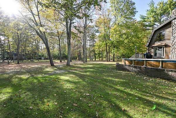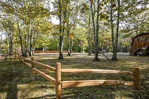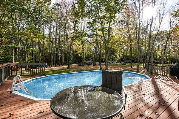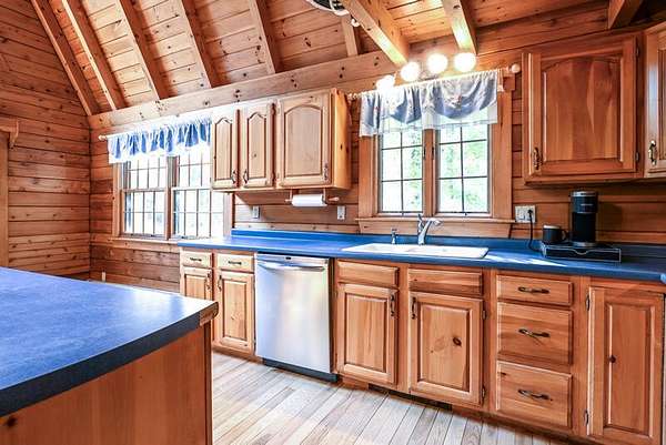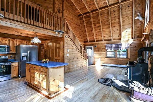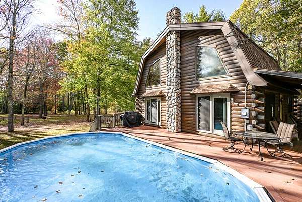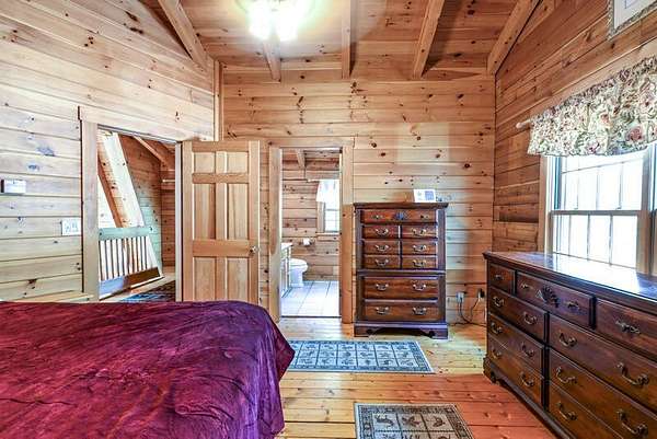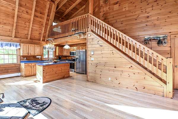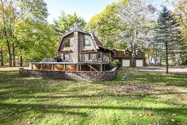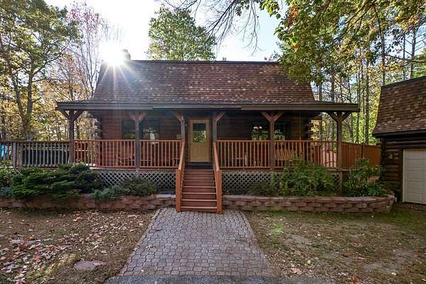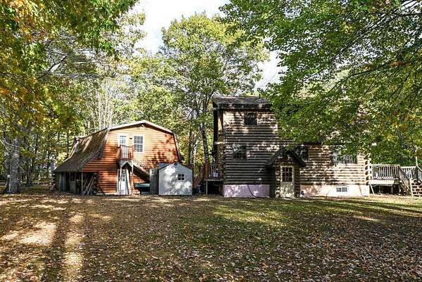 If you're looking for an Authentic Western Red Cedar Log Cabin Home with a 3 Car Garage and 1000 sq ft ADU above... HERE IT IS! The Main Home features 1344 sq ft of living space with 2 Bedrooms & 2 Full Baths. The minute you walk into this lovely home you will be impressed by the Open Concept Main Living Area accented by 22 ft high Cathedral Ceilings, Post & Beam structure and an abundance of natural light from the large oversized windows and glass doors, knotty pine ceilings & walls and hardwood floors throughout. The sun filled Eat-in Kitchen boosts of custom pine cabinets, a Center Island & Pantry, the spacious Living Room is centered around a beautiful Stone Hearth & Wood Burning Stove, oversized windows & double glass sliding doors on each side of the hearth lead out to a large Wood Deck that surrounds the 18 x 33 Oval Above Ground Pool, behind the staircase you'll find a First Floor Bedroom, A 3/4 Bath with Stand Alone Shower, and a separate Laundry Room. Up the authentic wood staircase with log railings is a quite Reading Nook or Loft and a large private Primary Bedroom Suite with its own Private Bath with Jetted Tub and His & Hers Walk-in Closets. Stepping outside onto the covered Farmers Porch, a few steps to the oversized 3 Car Garage with the 1000 sq ft ADU above. This unusually spacious ADU features an Open Concept Eat-in Kitchen with 19 feet of Oak Cabinets & Countertops, plenty of space for your Dining Area and large Living Room. In addition, you'll find 2 large Bedrooms and Full Bath with Tub & Shower and Washer & Dryer. Whether you're looking for extra rental income or simply need more space, this property offers a unique opportunity. The family complex was purposely set back from the main road on a cleared 2 Acre Lot completely surrounded by trees around the perimeter of the property affording you the ultimate in privacy. Conveniently Located in rural North Saco, but only a short drive to downtown Saco or Scarborough. MUST SEE TO FULLY APPRCIATE!