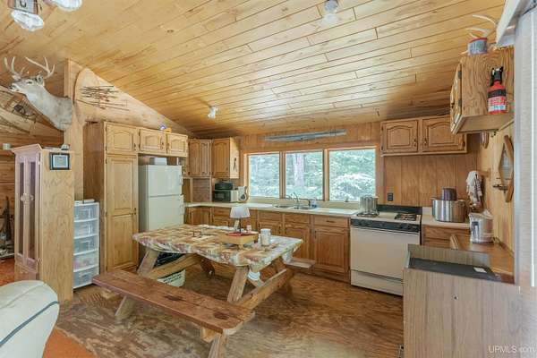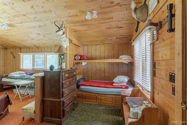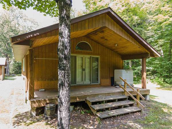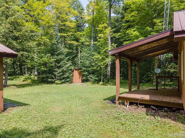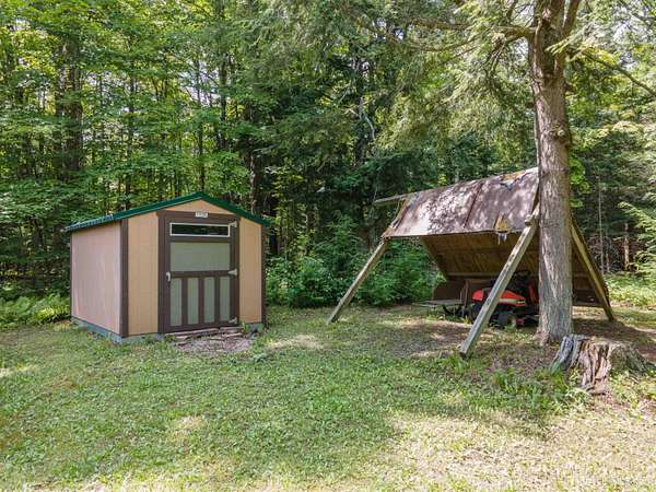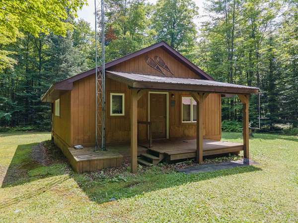 Looking for a hunting camp? This open-concept cabin on a wooded 5-acre parcel offers a bunk area that includes two full size mattresses and two twin size, eat in kitchen, and large living room, and includes both a covered rear deck and covered front porch! Outside, there is a roomy garage/shop that also includes a sauna and shower area, and a large storage shed, included in the sale is two generators and a 6-panel solar system that will need to be installed. Thie property is conveniently located on a recreational trail (snowmobile and ATV), near many waterways and boarders federal and commercial forest land. The cabin has cable ran for both antenna and satellite TV and also has both 12V and 110 power in the cabin and garage. The cabin does have a new 35,000 BTU space heater.
