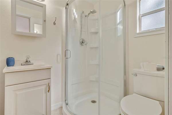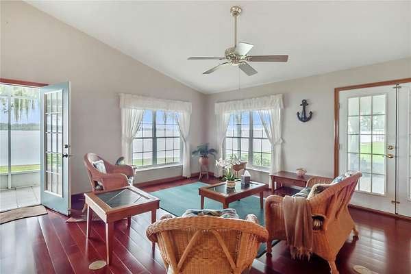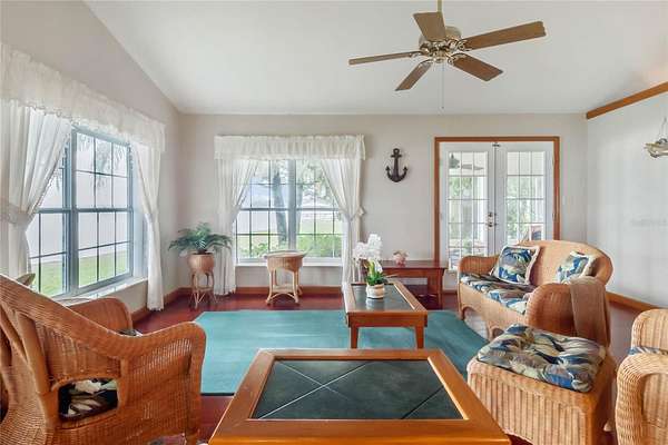 The main residence offers 2 bedrooms and 2 bathrooms, thoughtfully positioned to maximize the stunning waterfront views. The eat-in kitchen includes a center island, oak cabinetry, and a reverse osmosis water filtration system. The expansive great room is adorned with French doors that open to a screened-in lanai, nestled under the shade of a majestic oak tree and surrounded by lush tropical landscaping.