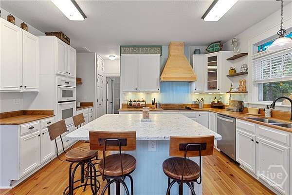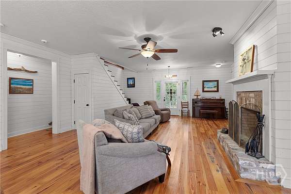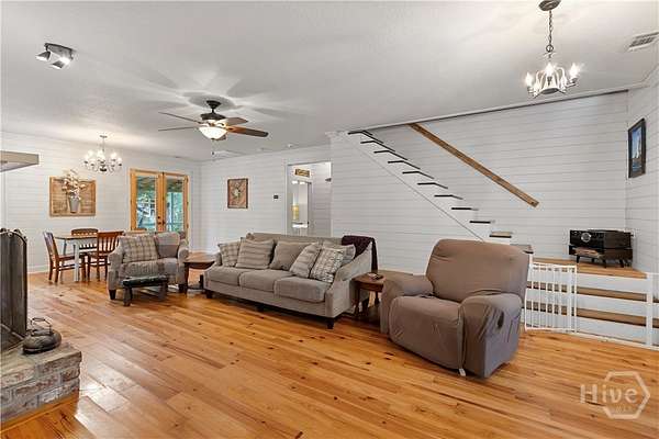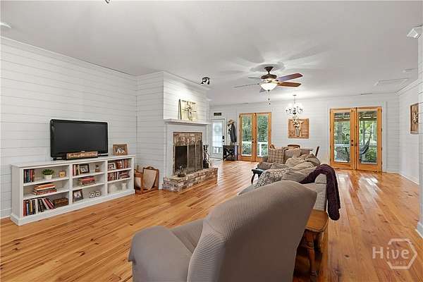 PRICED BELOW APPRAISED VALUE! All windows replaced in 2023! Discover your private oasis on 2.96 acres on Colonel's Island-one of Georgia's most pristine barrier islands. This charming Low-Country home has it all: an in-ground pool, no HOA, and room for your boat and RV. The country kitchen boasts handcrafted black walnut countertops, abundant cabinetry, and an island with wine fridge. The spacious living/dining area features shiplap walls and a cozy wood-burning fireplace. Enjoy gorgeous heart pine wood flooring in the living areas. The main level offers a large primary suite with en suite bath and walk-in closet, plus an additional bedroom and full bath. Upstairs, a loft/second living space with tongue-and-groove yellow pine paneling leads to two more bedrooms and a full bath. Relax on the front porch or the covered back deck and take advantage of the workshop, pole barn, and chicken coop. A rare chance for peaceful, private island living!
