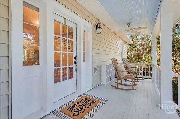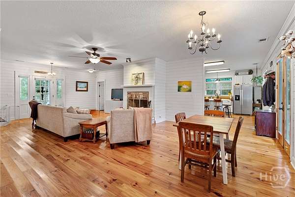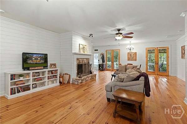 PRICED $36,000 BELOW APPRAISED VALUE! All windows replaced in 2023! Discover your private oasis on 2.96 acres on Colonel's Island-one of Georgia's most pristine barrier islands. This charming Low-Country retreat offers the perfect blend of comfort, privacy, and coastal lifestyle with no HOA and plenty of space for your boat and RV. The inviting country kitchen features handcrafted black walnut countertops, abundant cabinetry, and a center island with a built-in wine fridge-perfect for entertaining. The spacious living and dining area showcases beautiful heart pine flooring, classic shiplap walls, and a cozy wood-burning fireplace that creates a warm and welcoming atmosphere. The main level includes a generous primary suite with an en suite bath and walk-in closet, along with a second bedroom and full bath. Upstairs, a loft-style second living area with tongue-and-groove yellow pine paneling leads to two additional bedrooms and another full bath-ideal for guests or flexible living space. Step outside and enjoy the peaceful surroundings from the front porch or covered back deck, overlooking nearly three acres of private land. The property also includes an in-ground pool, workshop, pole barn, and chicken coop, offering endless possibilities for hobbies, storage, or homesteading. This is a rare opportunity for peaceful, private island living just minutes from the Georgia coast.