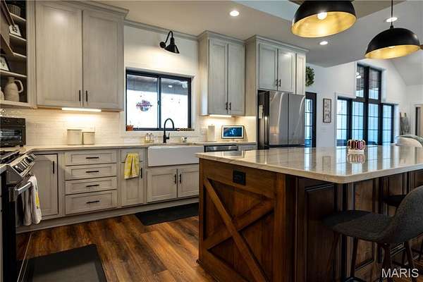 The thoughtfully designed kitchen showcases reinforced support beneath the island cabinetry and a large walk-in pantry conveniently located just off the kitchen, creating both beauty and functionality for everyday living and entertaining. The home also features a spacious laundry room, bricked mudroom for added durability, whole-home water softener, and a security system already in place.