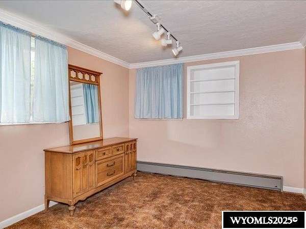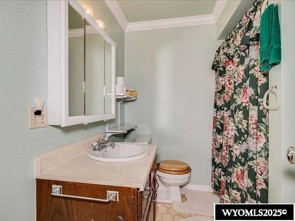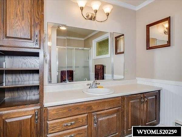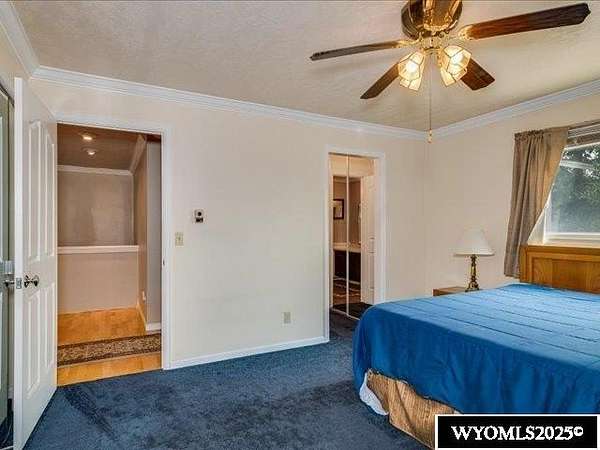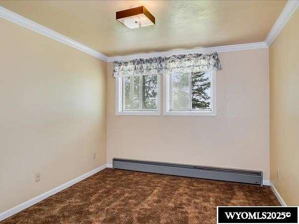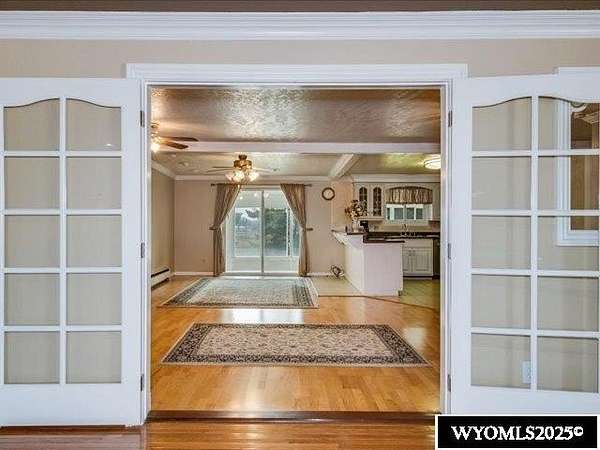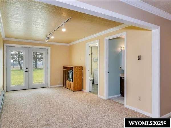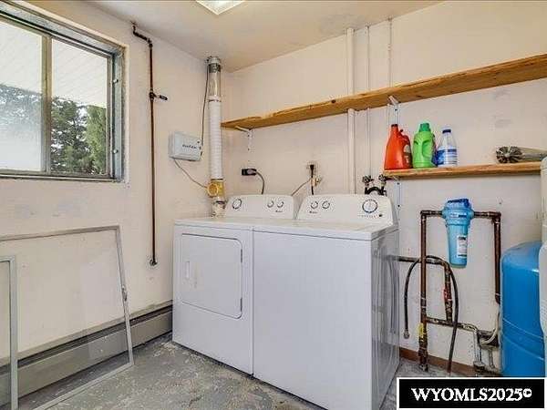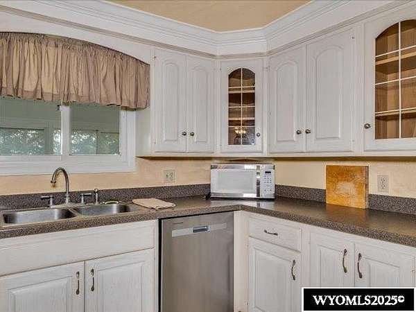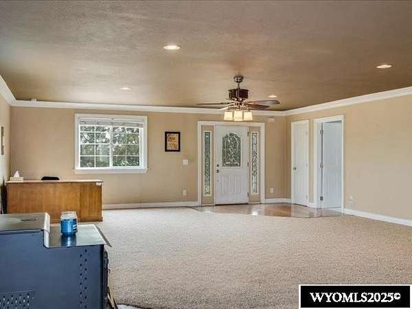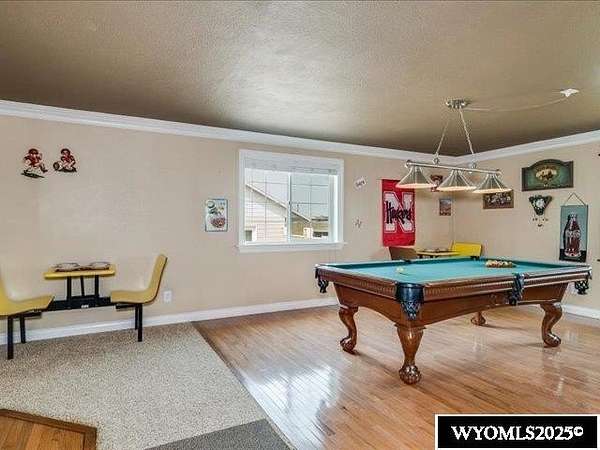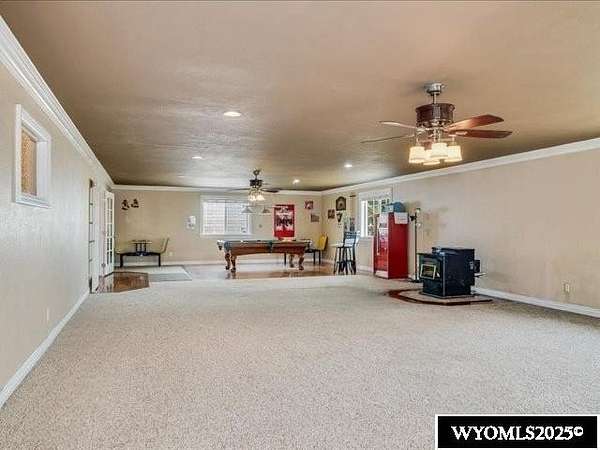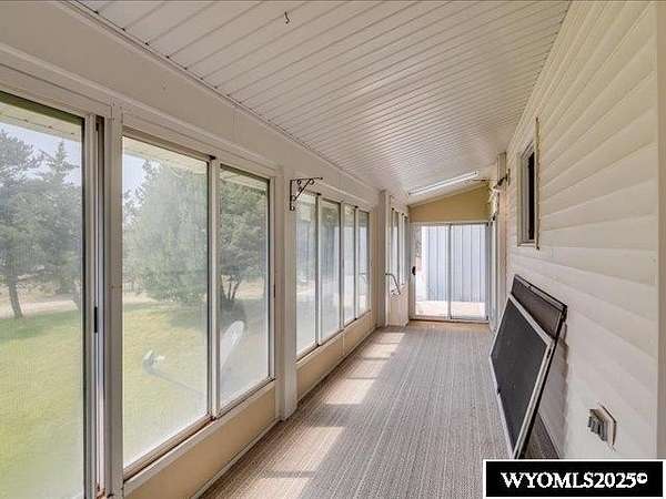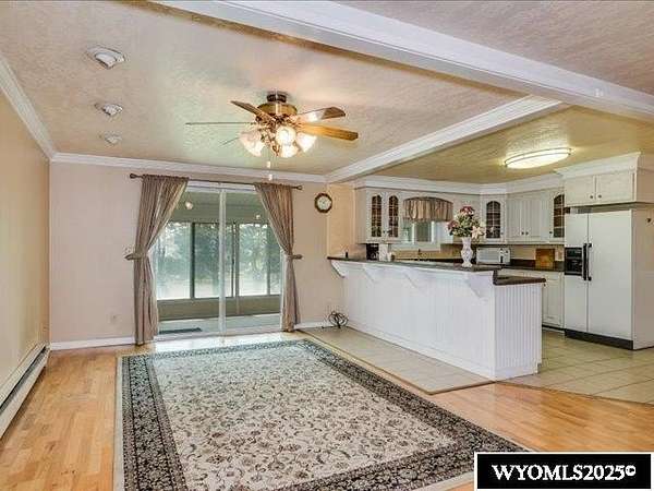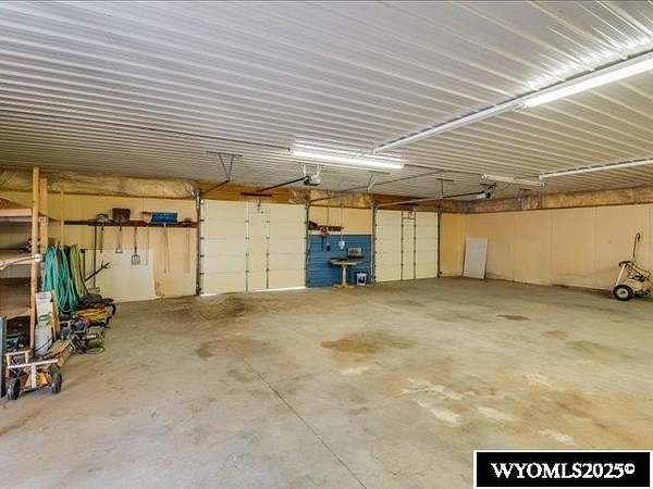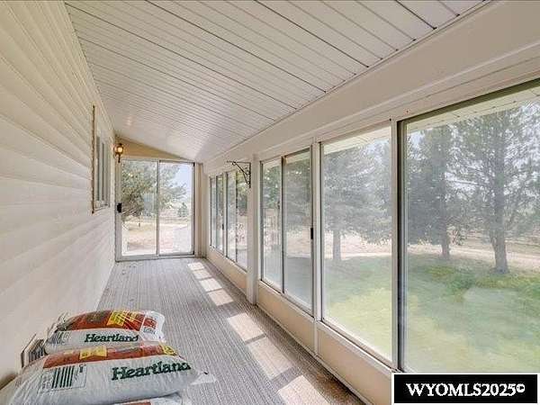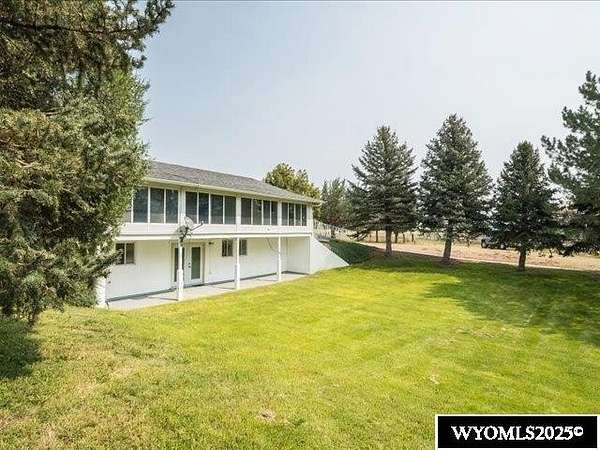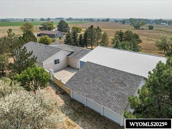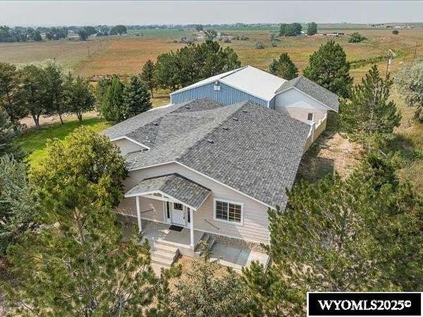 Nestled on a sprawling 6-acre property, this captivating country home combines comfort and rural charm, making it perfect for horse enthusiasts or those interested in livestock or poultry. The main level spans an impressive 2,311 square feet, complemented by a walk-out basement with an additional 1,400 square feet of living space. Inside, the open floor plan features a spacious 23' x 49' family room, complete with a pool table and built-in booths, ideal for entertaining. The updated dining room and kitchen boast elegant crown molding, a combination of tile and hardwood flooring, and solid surface countertops. The cheerful sun porch, drenched in sunlight, and the south-facing yard, accessible from both the walk-out basement and patio, provide a picturesque setting for relaxation. Additional structures include a well-equipped insulated and wired shop that can hold 6 cars, and another structure with three additional stalls for equipment. Recent updates enhance the home with a brand-new class 4 roof, modern front and sliding patio doors. Luxurious features like a jet bathtub with a separate shower and a cozy pellet stove add to the home's appeal. This home is extremely well insulated resulting in shockingly low utilities; averaging $100/month. Surrounded by scenic farm fields and featuring an open-faced shelter for animals, this property epitomizes serene country living. A one-year home warranty is offered by the sellers. Contact Suzanne at 307-715-0217 to schedule a viewing of this extraordinary property.