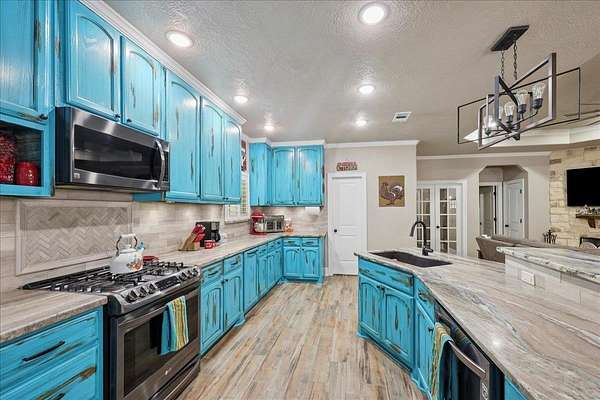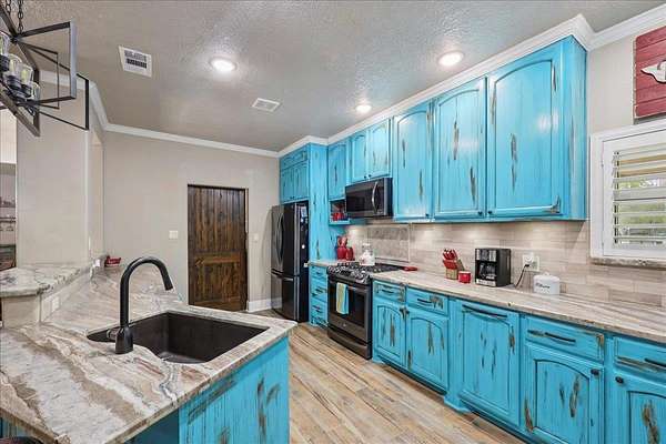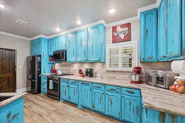 - Blinds/Shades, Breakfast Bar, Ceiling Fan(s), Free Standing Range, Gas Stove, Granite Counter Tops, Inside Utility Room, Open Concept, Pantry, Sheetrock, Split Bedroom Plan, Tile Floors