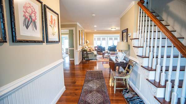 The entire main floor is covered in hardwood floors except for the main sunroom and the owner's suite sunroom that both have carpet.