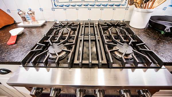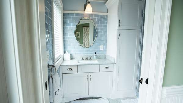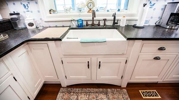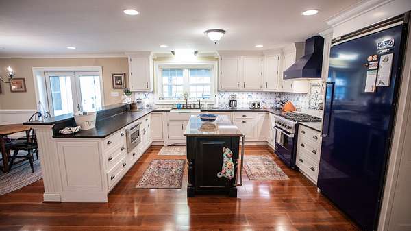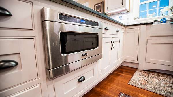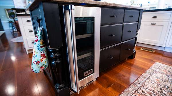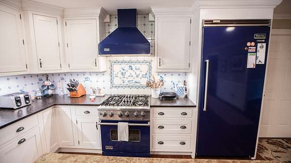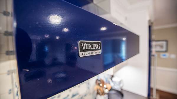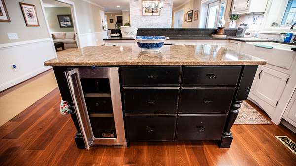 As you enter the main floor from the two car garage you'll find the kitchen, which has all Viking appliances that are pristine and do convey with the home. A porcelain farm sink is surrounded by leathered granite countertops, a tile backsplash and custom cabinets. There is also an island countertop with storage underneath and a Viking wine cooler.