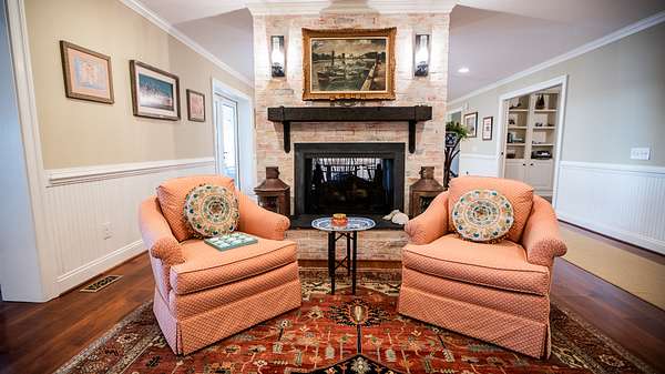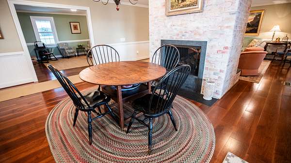Across from the kitchen is the dining room that has a large window looking out towards the fields to the north. The breakfast nook is a quaint area next to the double sided gas log fireplace and it has doors that take you out to the screened in portion of the back porch.
