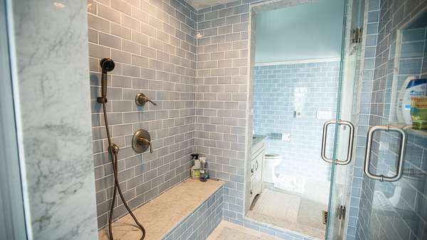 Down the long hallway are two more large guest bedrooms, complete with full bathrooms. The entire upstairs is carpeted except for the bathrooms that have custom tile flooring.