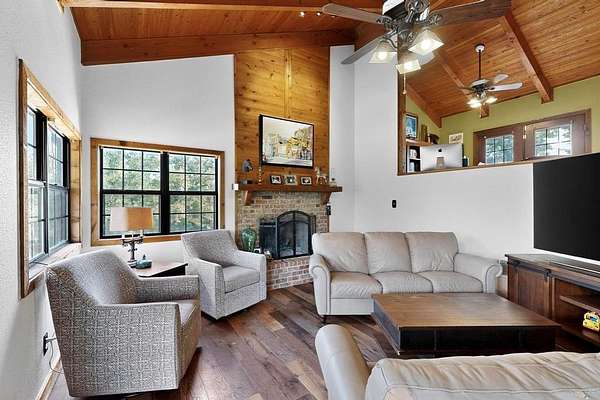 Every bedroom offers balcony access with sweeping views, while a spacious loft overlooks the open kitchen, living, and dining area--perfect for a second living room or home office. A separate 1 bedroom guest house (572 sq ft) includes its own full kitchen, bedroom, bath, washer-dryer connections, and tankless water heater, offering private accommodations for guests or extended family. Outdoors, enjoy 4 private ponds, a lake with dock potential, and your own water well. Ride ATVs through peaceful, scenic acreage filled with wildflowers, mature trees, and native grasses. This property is the definition of serene country living.