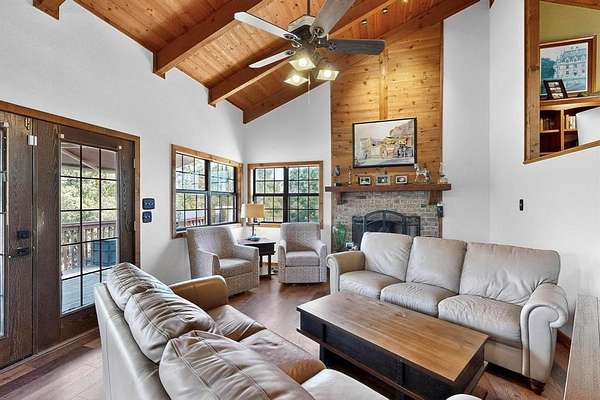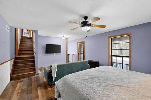 Set high above the land, this one-of-a-kind, three-story custom home offers stunning 360-degree panoramic views of rolling acreage, mature trees, wildflowers, and sparkling water--an ideal setting for nature lovers, weekend retreat seekers, or full-time rural living. The main residence features 3 bedrooms, 3 full bathrooms, and over 1,800 square feet of versatile living space. A walk-out basement currently serves as the primary suite, complete with a cozy nursery area and a cleverly tucked-away barber station within the closet--perfect for creative, multi-functional use. Each bedroom offers direct balcony access, allowing you to take in sweeping views from every level of the home. Double-hung windows throughout allow for easy exterior cleaning from inside the home. An open-concept kitchen, living, and dining area is complemented by a spacious loft overlooking the main living space--ideal for a second living area, home office, or flex space. The property has been well maintained with a well house completed in 2018, a newly replaced well pump (September 2025), and a new water heater installed in October 2025.
