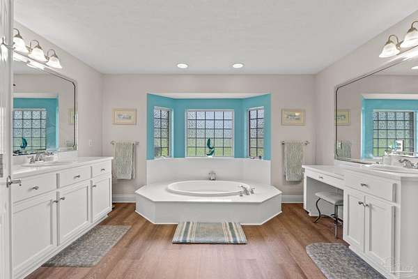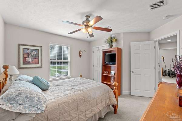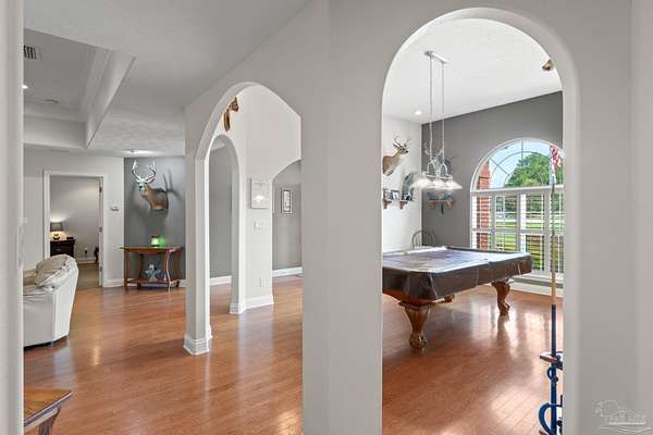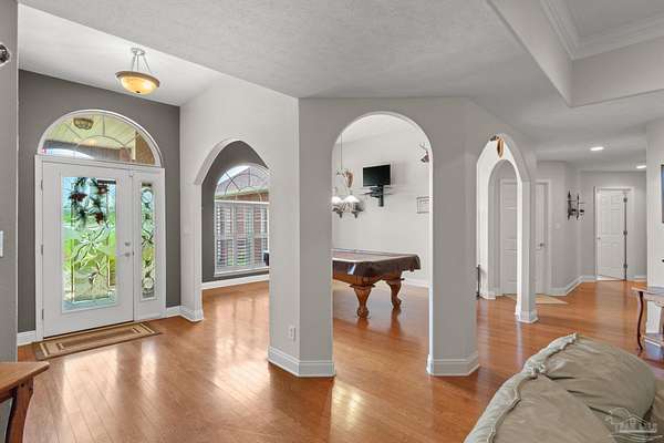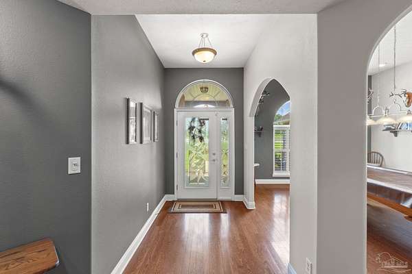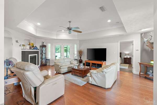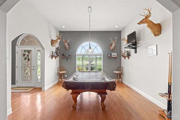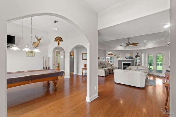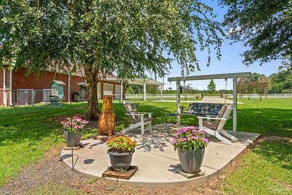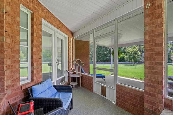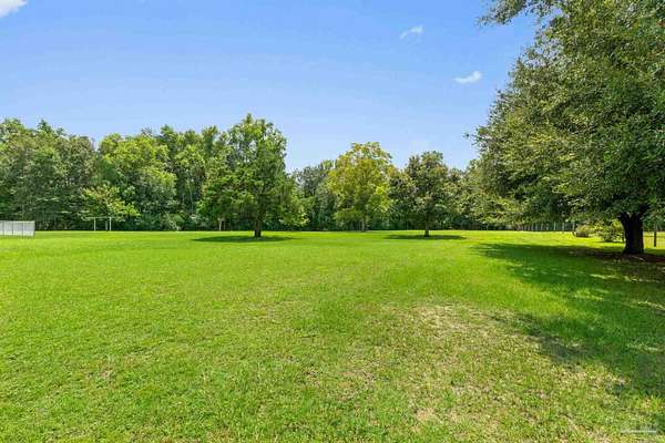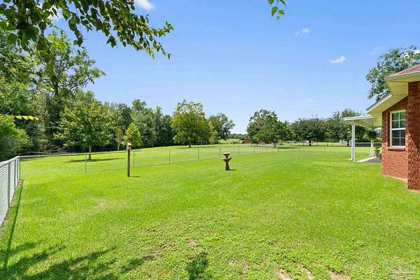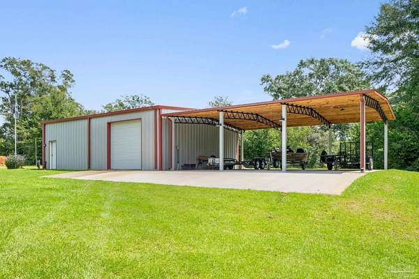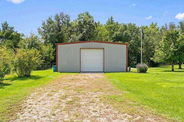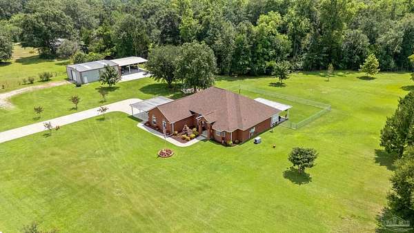 Beautiful Brick Country Estate on 7.5 Acres! Welcome to 4381 Molino Road, a charming brick country estate with space, character, and modern updates. Built in 2006, this 3-bedroom, 2-bath home offers 2,432 square feet of comfortable living space, set on 4 acres plus an adjoining 3.5 parcel for a total of 7.5 acres included in this listing. From the moment you arrive, you'll be struck by the curb appeal: lush grass, classic white horse fencing along the road, a flagpole out front, and charming landscaping. Step inside to a warm foyer with rich hardwood floors, architectural windows, arched doorways, and a living room with a tray ceiling, and electric fireplace. The bright dining room and large kitchen are made for gathering, with stainless steel appliances, a pantry closet, and a spacious breakfast nook that fits a full-sized table. The primary suite features 2023 luxury vinyl plank flooring, its own tray ceiling, double doors to the screened porch, and a spa-like ensuite with a separate soaking tub and abundant natural light. Two additional bedrooms with plush carpet offer plenty of comfort for family or guests. Out back, you'll enjoy a screened-in porch, covered patio, and expansive yard. The property also includes a large detached metal building and attached pole barn with 3 11ft bays that has both power and water, perfect for a workshop, storage, or hobbies. There is also another pole barn at the back of the property. Recent updates provide peace of mind: roof (2022), HVAC (2021), water heater (2022), concrete driveway, termite bond, and fabric hurricane shutters. This rare combination of acreage, upgrades, and country charm makes 4381 Molino Road a true fine. Don't miss it!