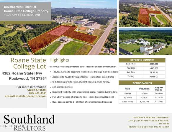 Experience unmatched commercial development potential on this remarkable 16.46+/- acre site adjoining Roane State Community College, a thriving campus with approximately 6,000 students and a 72,000-square-foot expo center that generates consistent traffic and offers a built-in customer base. Comprising seven strategically assembled parcels and zoned C-2 Highway Business District, this premium property offers exceptional flexibility for a variety of commercial ventures, including self-storage, student housing, multi-family development, hospitality, or retail. Development-ready infrastructure includes an existing 143,000+/- square foot concrete pad, approximately 968 feet of combined road frontage with dual access points, and full utility availability at the property line, eliminating delays and reducing upfront costs. The site benefits from a college-adjacent footprint with an institutional anchor that brings daily foot traffic, year-round consumer demand, and long-term development stability. The C-2 zoning allows for a broad range of commercial uses, such as shopping centers, restaurants, entertainment venues, hotels, and professional services, while the flexible development standards accommodate various business configurations in this growing commercial corridor. With immediate adjacency to Roane State's main campus and expo center, the property captures both daily student flow and event-based traffic, offering a prime location for student-oriented and general commercial applications. Documented traffic volumes include an average of 3,552 vehicles per day on Patton Lane (Location ID: 73000117) and 4,734 vehicles per day on Roane State Highway/Highway 70 (Location ID: 73000043), with additional volume generated by campus events and institutional activity. This exceptional 16.46+/- acre development site represents a rare opportunity to secure high-visibility commercial frontage with proven traffic counts, infrastructure in place, and direct access to one of East Tennessee's most stable and traffic-generating institutions. Whether you're planning a student-focused mixed-use project or launching a large-scale retail or service operation, this strategic location offers the ideal foundation for long-term commercial success. Buyer to verify all information.