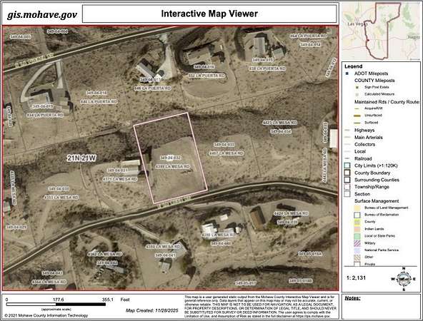 From Bullhead Parkway take highway 68 east for 2.3 miles. Right/south on La Puerta for 4.5 miles. Left/east on La Mesa. Lot is on the left.