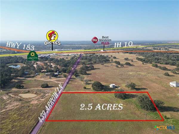 From San Marcos take Hwy 80 to Luling, right onto Hwy 183 S, cross train tracks at light and turn Left to continue on Hwy 183 towards Gonzales. Just before reaching IH 10 turn left at the light onto Old Hwy 90, left on Arrow Ln, property on Left.