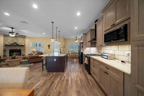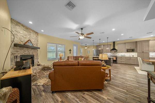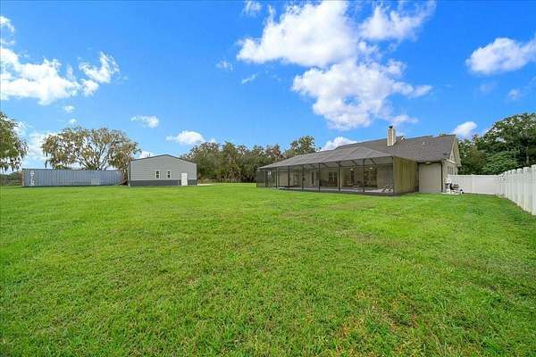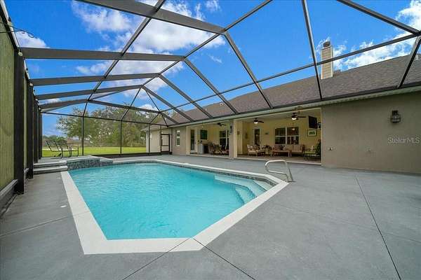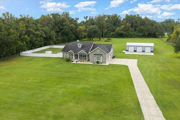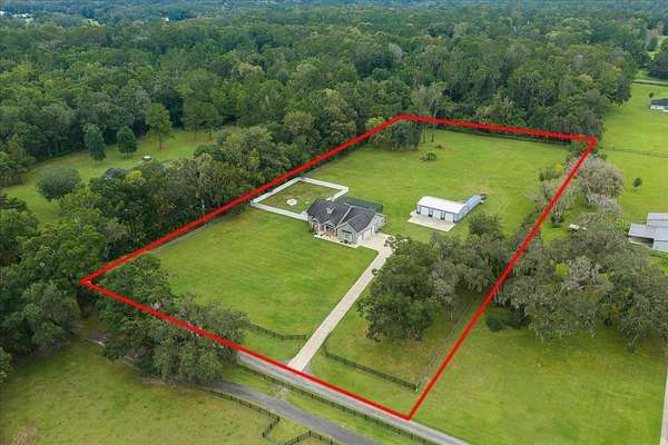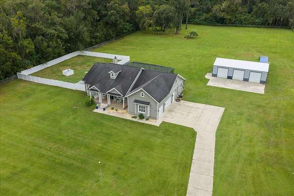 Discover where luxury meets country charm in this stunning custom 4 bedroom, 4 bath estate, perfectly set on 4.54 fully fenced acres of peaceful Florida countryside. Built in 2019 with only two owners, this home offers modern craftsmanship, thoughtful design, and the tranquility of country life, all while remaining close to schools, restaurants, shopping, and easy access to I75, plus Ocala's premier equestrian destinations. Step inside to find a split floor plan with LVP flooring throughout the main living area, combining comfort and durability. The spacious 3,144 sq. ft. layout welcomes you with warm tones and an effortless flow from room to room. The open-concept kitchen and dining area serve as the heart of the home, featuring a gas stove, large island, walk-in pantry, and ample counter space--perfect for entertaining family and friends. The cozy living room centers around a wood-burning fireplace, creating the perfect gathering space for quiet evenings. Each bedroom offers a walk-in closet, while the primary suite provides a true retreat with a luxurious ensuite bath, jetted soaking tub, walk-in tile shower, dual vanities, and direct access to the pool area. Upstairs, you'll find a bonus/game room with its own full bathroom, ideal for guests, a home office, or a media space. Step outside to your private backyard oasis, featuring a screened in lanai and sparkling saltwater pool with a waterfall feature, perfect for outdoor relaxation. Car enthusiasts and hobbyists will appreciate the attached 3-car garage, along with the detached 30x50 workshop equipped with 200amp electric panel and concrete floor, plus a 40' shipping container for additional storage.This property is zoned A1 with No HOA or deed restrictions, allowing for two homes and welcoming horses, cows, goats, chickens, and more, ideal for equestrian or hobby farm living. Conveniently located just 5.3 miles from the Florida Horse Park, 25 miles from the World Equestrian Center, and 28 miles from HITS.