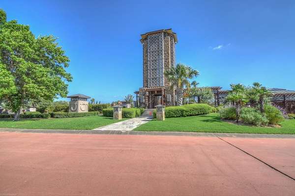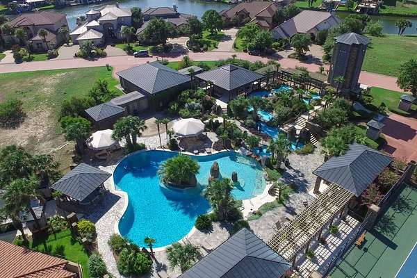 FM 2147 to Bay West Blvd, all the way to Applehead Island, guard gate.