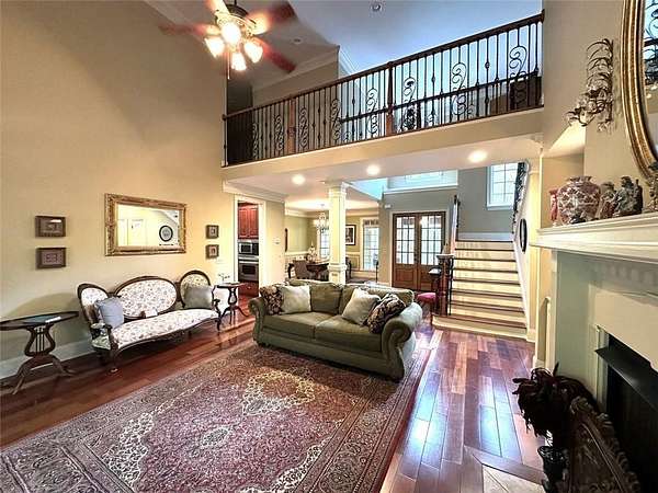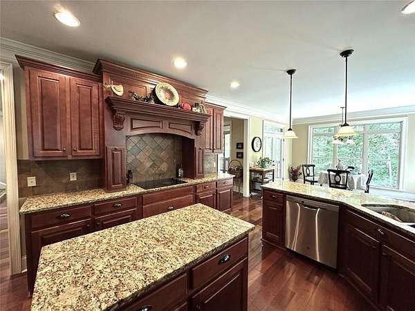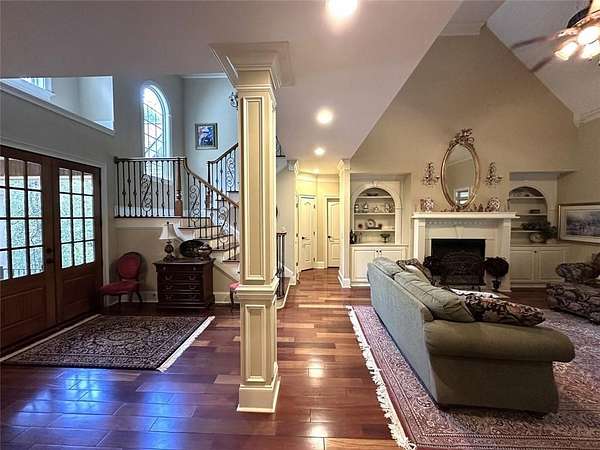 The main level displays beautiful Brazilian cherry hardwood floors throughout complimented by elegant crown molding and extra-large shoe molding details. Cathedral ceilings in both the large living room and spacious den, two marvelous stone fireplaces with gas logs create warm gathering spaces, while the covered front and back porches extend your living area outdoors. The culinary kitchen with extra-large kitchen island and breakfast area is massive. The large and formal dining room is accented by the stunning grand staircase which serves as an impressive main level focal point.