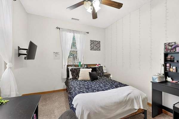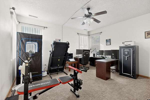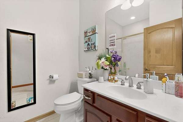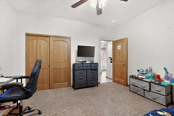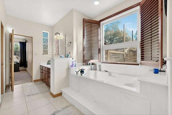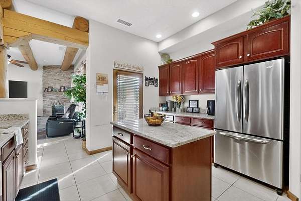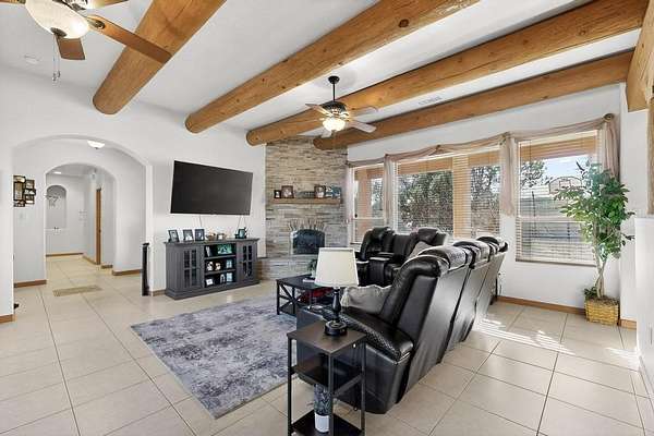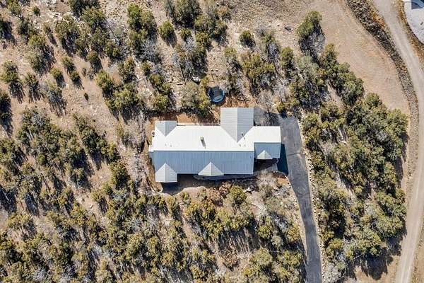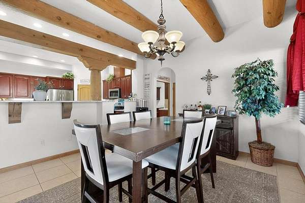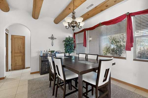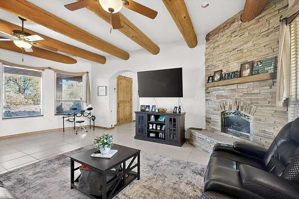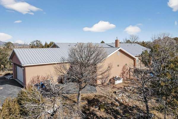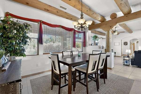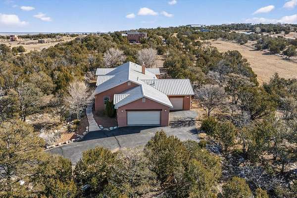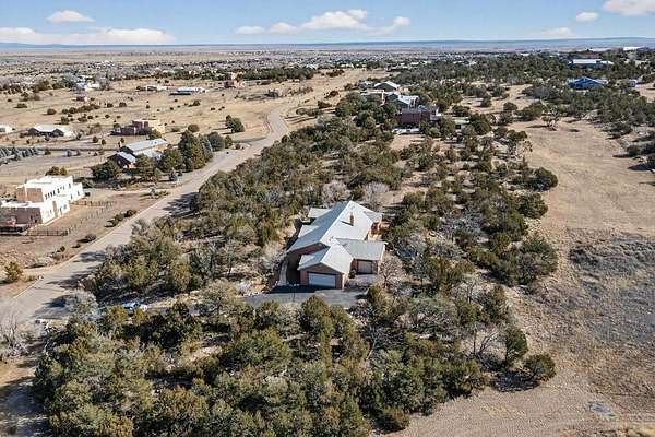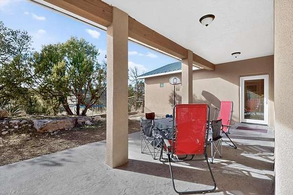 Striking Southwest inspired 5-bedroom, 3 bath home, thoughtfully positioned within a grove of junipers for exceptional privacy and natural beauty. Once inside, you'll experience exposed ponderosa pine vigas, sun-filled picture windows, custom stacked-stone fireplace, tile flooring that enhances all living spaces, complemented by plush carpeting in the bedrooms.Thoughtfully designed kitchen features cherry cabinetry, granite countertops, pantry, and a convenient bar-top opening to the dining area--perfect for entertaining. Step outside to the covered back patio and enjoy the beauty of the surrounding natural landscape. The primary wing is a true retreat, showcasing a spacious bedroom, with adjoining sitting room, office, game space, or an additional bedroom. Dual walk-in closet