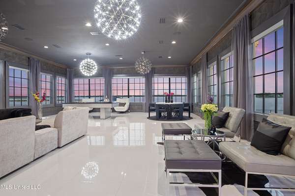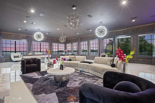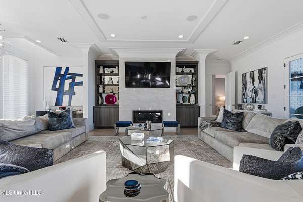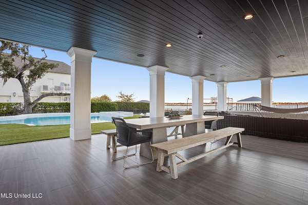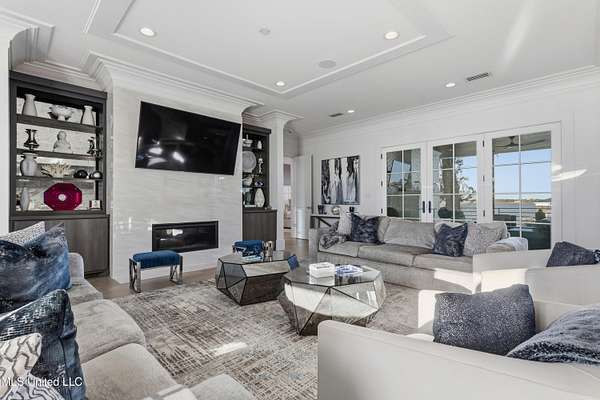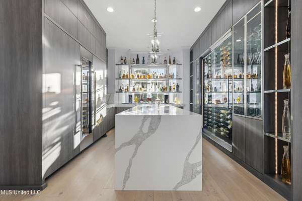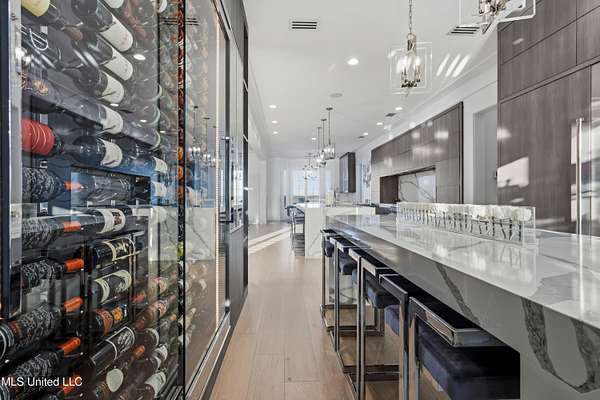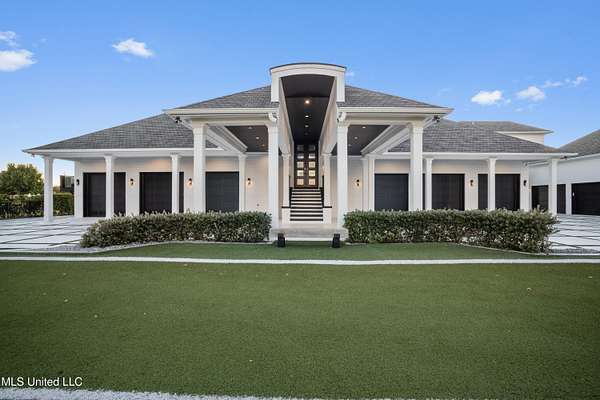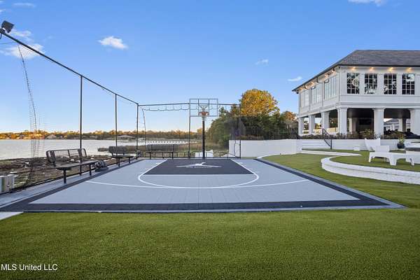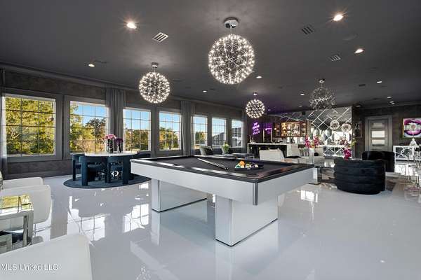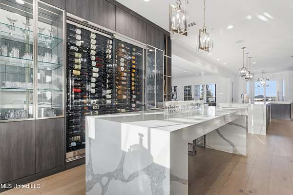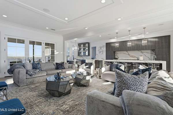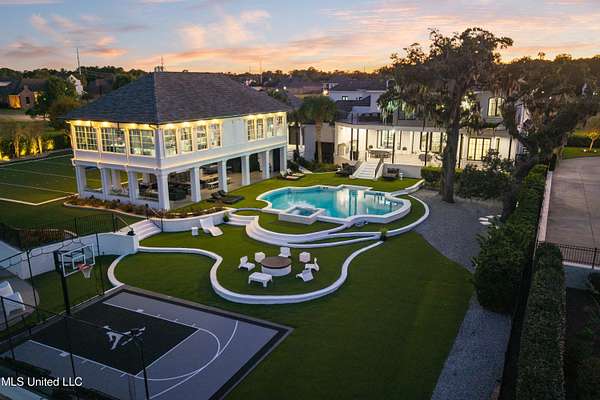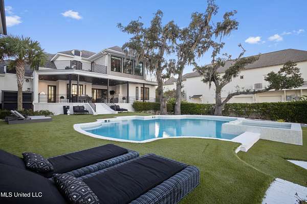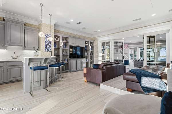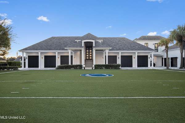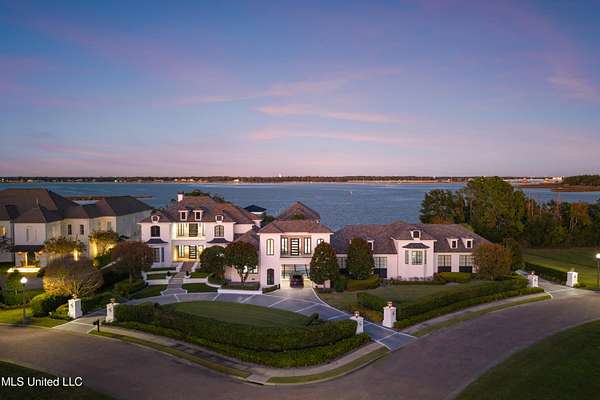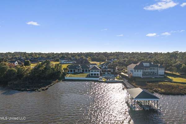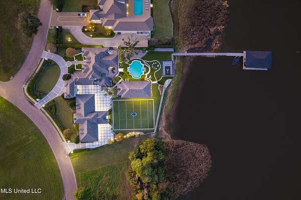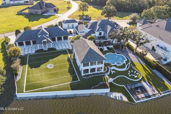 An unbelievable custom home situated on two waterfront lots in the Goose Pointe subdivision. Totaling 1.7 acres of prime waterfront property. This custom home has everything you could dream of for your family and entertaining! A grand living room with fireplace, built-in cabinets, a spacious kitchen that is equipped with top-of-the-line appliances, quartz waterfall edge countertops, a built-in dining table with waterfall edge, and a floor to ceiling wine wall. Gorgeous designer light fixtures throughout the home. The primary bedroom overlooks the water and has every custom designed feature you can think of. Upstairs, you will find four bedrooms with high ceilings, built-in bookcases, and countless custom features, and large closets. There's also a media room with built-ins and a full wet bar as well as a bonus room with built-in bunk beds. Enjoy views of the water from the second story balconies. The main house has an attached in-law suite. The in-law suite has its own private balcony, living room, kitchenette, and a full bath. There is also a separate entertainment room with a full bathroom, full kitchen and a wet bar overlooking the water. For the car lover, there is an eight car garage with a car lift and spinner. The garage area also consist of a gym, an office, and a half bath. A picturesque salt water pool, fire pit, outdoor kitchen, and bar provide the perfect space for outdoor entertaining. The outdoor space also consist of an Astroturf football field and basketball court. The dock and boathouse come suited with boat lifts and floating docks. This property underwent a remodel 3 years ago and is being sold completely furnished. This property is a showstopper!