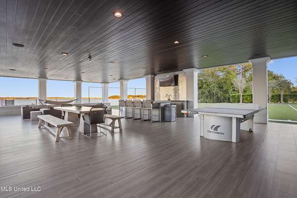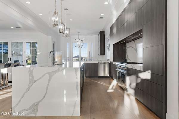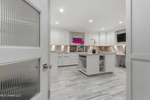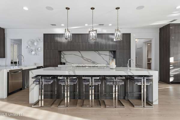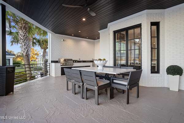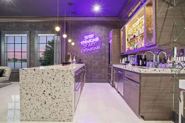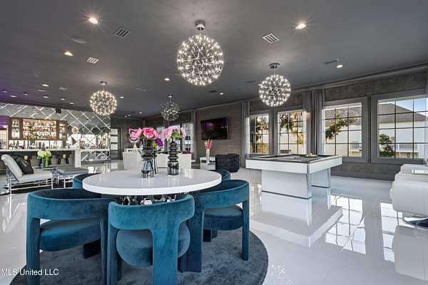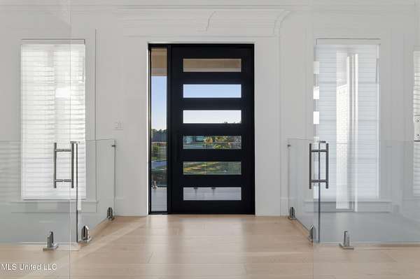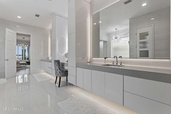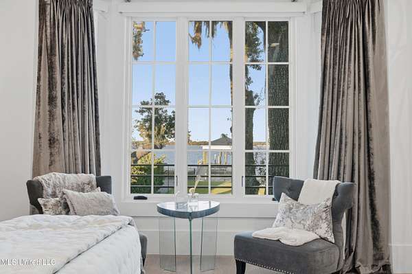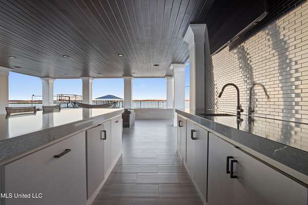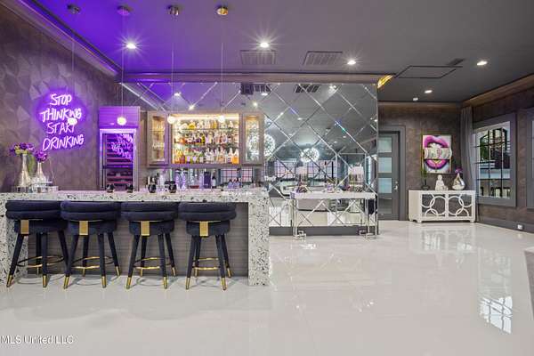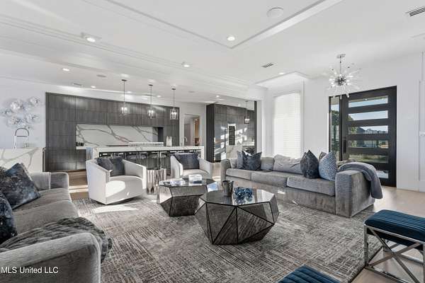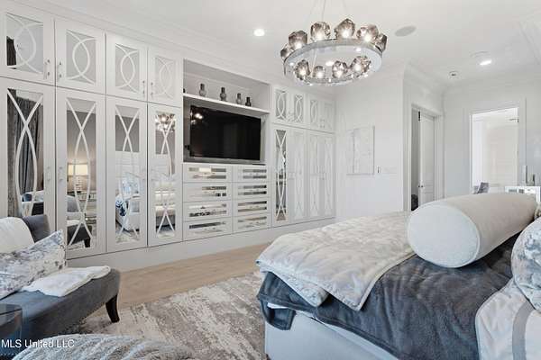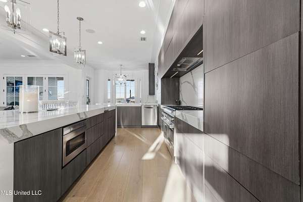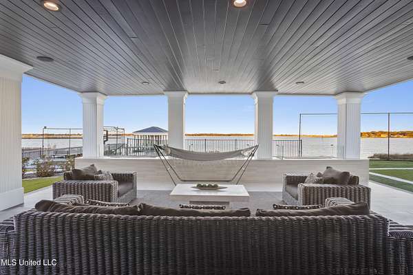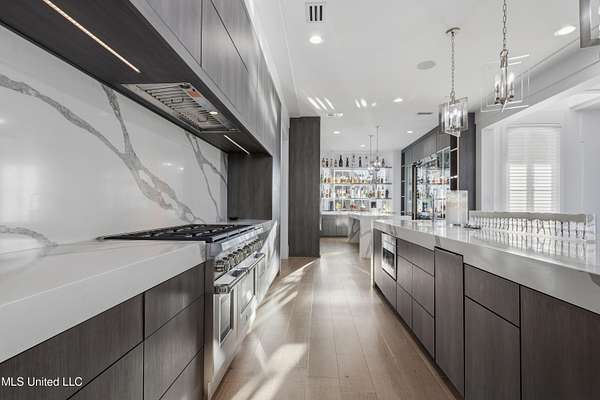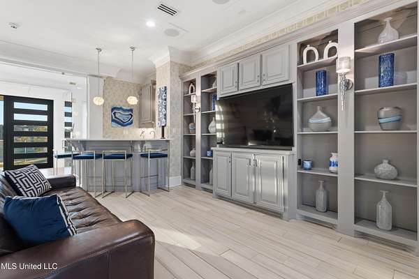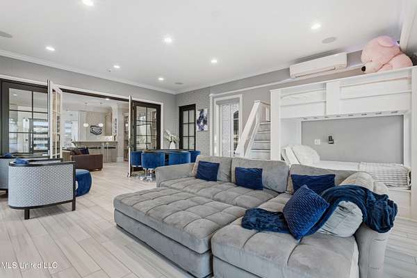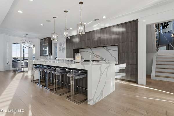 An unbelievable custom home situated on two waterfront lots in the Goose Pointe subdivision. Totaling 1.7 acres of prime waterfront property. This custom home has everything you could dream of for your family and entertaining! A grand living room with fireplace, built-in cabinets, a spacious kitchen that is equipped with top-of-the-line appliances, quartz waterfall edge countertops, a built-in dining table with waterfall edge, and a floor to ceiling wine wall. Gorgeous designer light fixtures throughout the home. The primary bedroom overlooks the water and has every custom designed feature you can think of. Upstairs, you will find four bedrooms with high ceilings, built-in bookcases, and countless custom features, and large closets. There's also a media room with built-ins and a full wet bar as well as a bonus room with built-in bunk beds. Enjoy views of the water from the second story balconies. The main house has an attached in-law suite. The in-law suite has its own private balcony, living room, kitchenette, and a full bath. There is also a separate entertainment room with a full bathroom, full kitchen and a wet bar overlooking the water. For the car lover, there is an eight car garage with a car lift and spinner. The garage area also consist of a gym, an office, and a half bath. A picturesque salt water pool, fire pit, outdoor kitchen, and bar provide the perfect space for outdoor entertaining. The outdoor space also consist of an Astroturf football field and basketball court. The dock and boathouse come suited with boat lifts and floating docks. This property underwent a remodel 3 years ago and is being sold completely furnished. This property is a showstopper!
