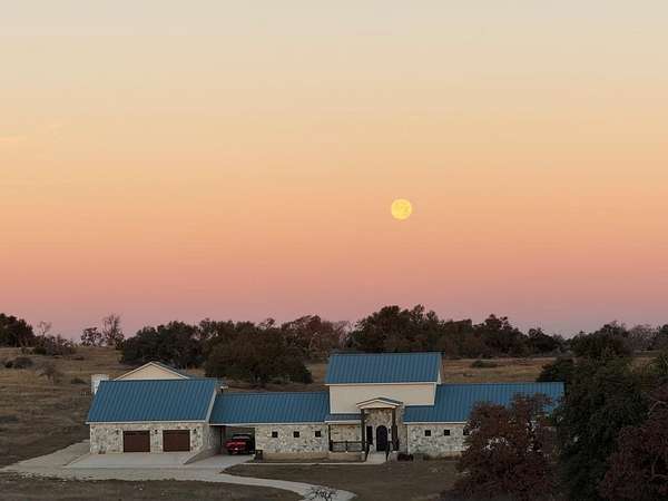 3BR / 3.5BA CUSTOM BUILT MASTERPIECE with exceptional design and craftsmanship throughout all on 10 acres. Built with quarried New Mexico exterior stone, a standing seam metal roof, spray foam insulation, expansive covered porches, and stone patios this home is truly unlike any other as it sits high on a rural Texas hill. Guests are welcomed by a striking custom-designed metal front door, setting the tone for the quality and attention to detail found inside. Abundant windows frame the surrounding landscape and flood the home with natural light. The thoughtfully designed split floor plan complements the open-concept layout, creating both privacy and seamless flow. An impressive great room showcases soaring ceilings accented by hand-crafted wood beams, a large low-maintenance electric fireplace, and a dramatic wall of windows. The exceptional kitchen is designed to impress featuring a massive marble island with a carved stone sink, six-burner gas cooktop, double ovens with warming drawers, and abundant cabinetry and storage. A tucked-away butler's pantry adds both function and luxury, complete with a sink, wine cooler, marble countertops, and extensive storage. Facing north, the primary suite is a true retreat, featuring expansive windows that frame panoramic views of the beautiful Texas hills, a private exterior door, and a spacious walk-in closet with custom built-ins. Completing this serene oasis is a luxurious en suite, spa-like bathroom. Enjoy the oversized walk-in shower with dual rain heads and a skylight that fills the space with natural light. Dual undermount sinks with imported mother-of-pearl handles accent the marble-topped vanities. The generously sized soaking tub, designed for two, includes a built-in heater to keep the water warm throughout your relaxing bath. Step out onto heated floors. On the opposite side of the home, a dedicated office offers stunning outdoor views through large windows, creating an inspiring workspace. A convenient powder room highlights the petrified wood sink from Estonia. A second primary suite provides exceptional comfort and accessibility, featuring wheelchair-friendly design, a roll-in shower with wraparound seating and rain heads, dual vanities, and a striking stone accent wall. Additional highlights include a spacious utility room complete with a sink, expansive countertop space, and abundant storage to keep everything organized and within reach. Just outside is a covered parking space and two over-sized garage spaces. The fabulously successful 800 SQ FT Dark Skies Hideaway guest house with front porch is just a few steps away. Built with the same inspiration as the main house, an open concept shares the living space, sleeping area & full kitchen. Over the bed are two skylights placed so the brilliant Texas skies may be enjoyed without ever stepping outside. The bathroom doors are uniquely gorgeous slabs of wood which open to reveal a walk-in shower with glass walls. A full-sized utility room equipped with a washer and dryer & pantry are included. Only a 15 minute drive from Fredericksburg, impeccable construction quality and refined design details make this home truly stand out. There are miles of paved roads inside the gated Ranches at Overhills to be enjoyed by walking, biking, or jogging while seeing the cattle (ag exemption) and native wildlife. YouTube: https://www.youtube.com/watch?v=gZ7uNou1kLw