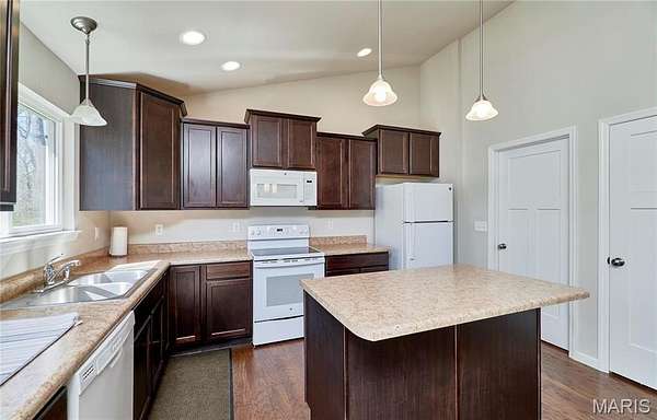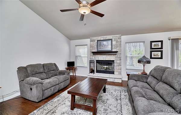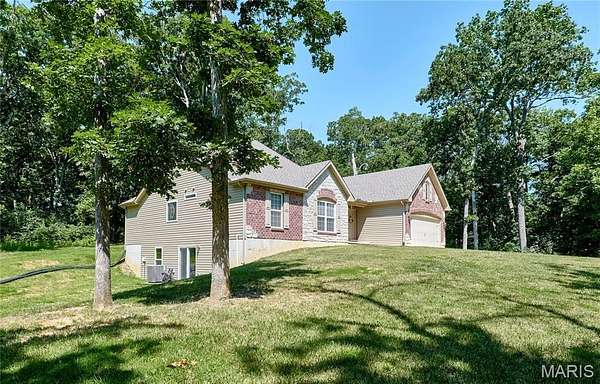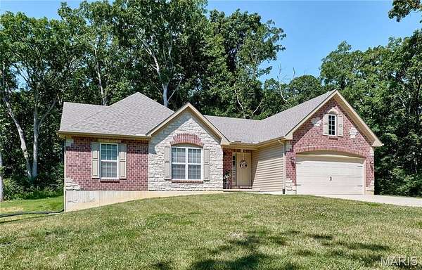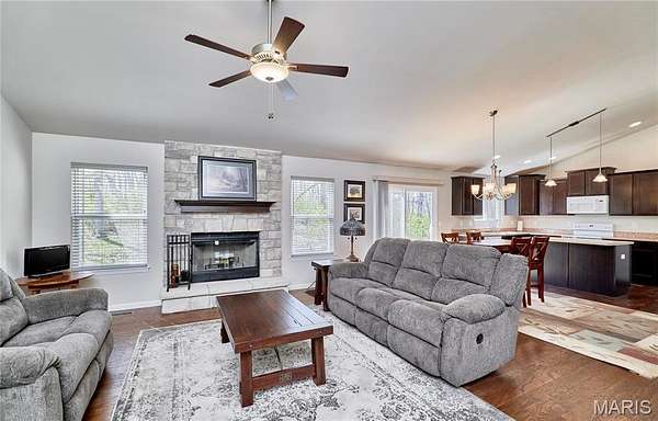Just 5 years young, this lovely brick and stone front home is nestled on 3 peaceful acres with plenty of privacy and the convenience of paved roads. Step inside to the vaulted ceilings, a cozy stone wood-burning fireplace, and engineered wood flooring that flows throughout the main living space. The open kitchen is a delight with staggered cabinetry topped with crown molding, a center island with breakfast bar and scenic views of the backyard. The private primary suite will be your retreat, complete with a spa-like ensuite bath featuring a dual vanity, corner soaking tub, separate shower, and an oversized walk-in closet. Additional highlights include main floor laundry, a walkout basement with rough-in bath ready for your finishing touches and a large back patio perfect for entertaining or relaxing. There is still 5 years remaining on the structural portion of the builder warranty and a Leaf Filter Gutter Protection system for extra peace of mind. This move-in-ready home offers the space, features and setting you've been searching for!
