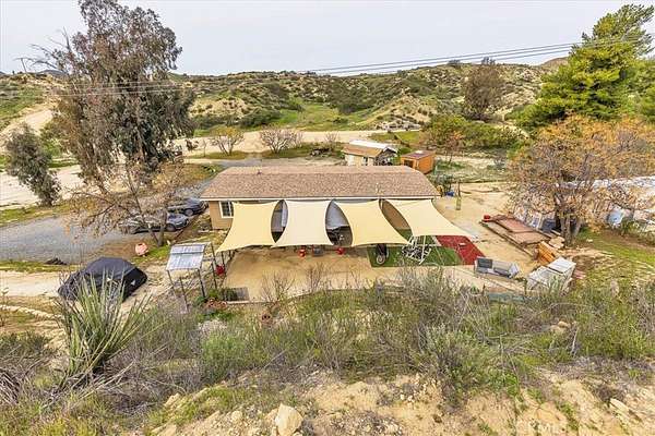 A peaceful country escape on 1.80 Acres of mostly flat and usable land in Aguanga. The property is at the end of a cul-de-sac and is very secluded. Enjoy rural living while still having the convenience of being close to all the amenities Aguanga has to offer. This single story manufactured home boasting 3 bedrooms and 2 bathrooms (1bdr was converted into office), 1344 sq. ft. home offers plenty of space for everyone to enjoy. The kitchen with an open concept to the family room has been recently updated with granite counter tops, island, stainless steel appliances and cherry cabinets. Bathrooms were recently remodeled as well with walk-in custom showers, oiled bronze fixtures. Home has a private shared well and it is on septic. There is 1 water storage tank that holds 5,000 gallons. New water heater 2024 and new water pump installed in 2025, leased propane tank. New roof and siding installed 2016. It has a lot of country charm and provides a few out buildings great for storage, workshop, chickens and many other farm animals. At the backyard you find custom build woodburning fireplace, your own fruit trees: two apples, nectarine, plump, lemon, pomegranate, two figs' trees. This property has so much to offer, bring your horses and animals and enjoy a life of great space. The home is close to town and Schools. Low property tax and No HOA Fees! While the home offers rustic charm, it does need some TLC making it a great opportunity for CASH buyers. With direct access to nearby horse trails and plenty of room to grow, this property is ready for your vision. Bring your animals, your tools, and your dreams. Your country's lifestyle awaits. Enjoy stunning views, quiet surroundings, and convenient access to Hwy 371, Hwy 79, and a nearby casino. Just minutes from Anza and a short drive to Temecula Wine Country.