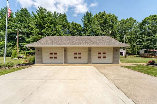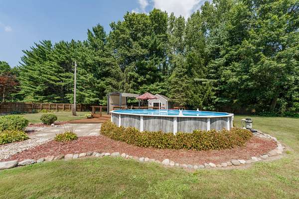 Expanded Farmhouse on 10 acres. If you love the outdoors this property is for you. The additions to the original farmhouse give you modern living in a very spacious home. Well thought out details like the concrete driveway that is measure out to be a pickle ball court. The three car garage has one stall that is insulated so you can work on projects year round. The original farmhouse now contains 3 bedrooms, one bath, laundry/utility. The first addition added the covered porch, foyer, living room, kitchen and large dining/family room and the most recent addition expanded the family room and added a luxurious bath and 384 sq ft loft bedroom. Outside enjoy the pool with deck, patio, water feature, expansive yard, 864 sq ft barn and 12x12 pool house with landscaped hammock area.