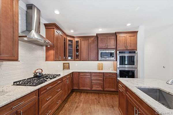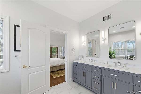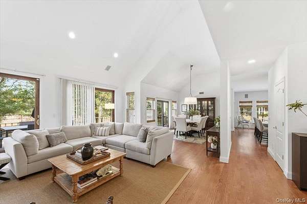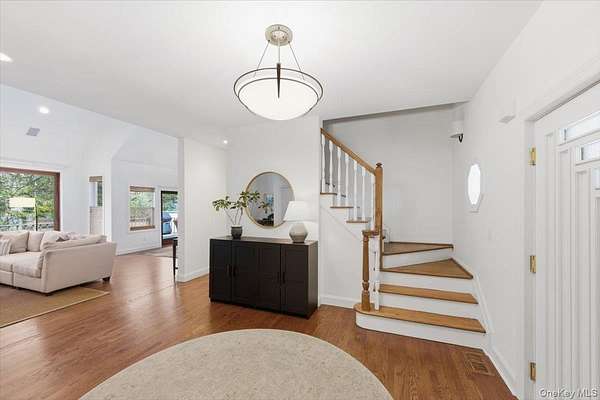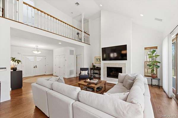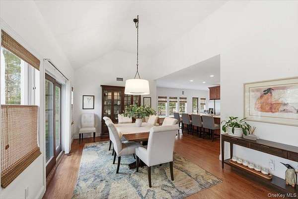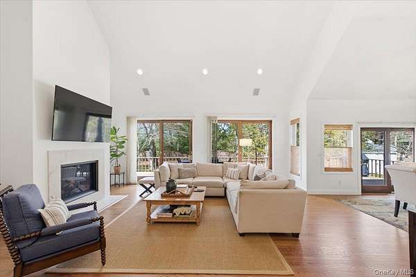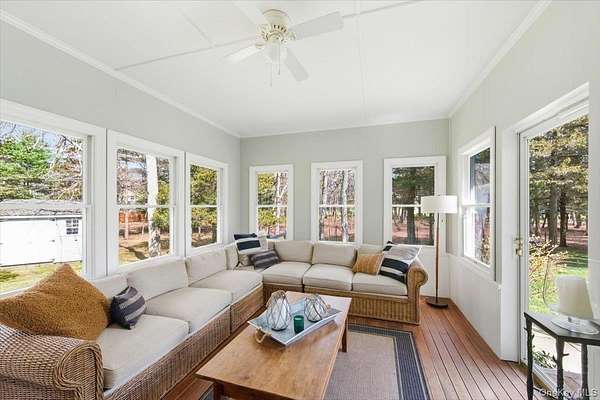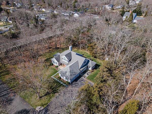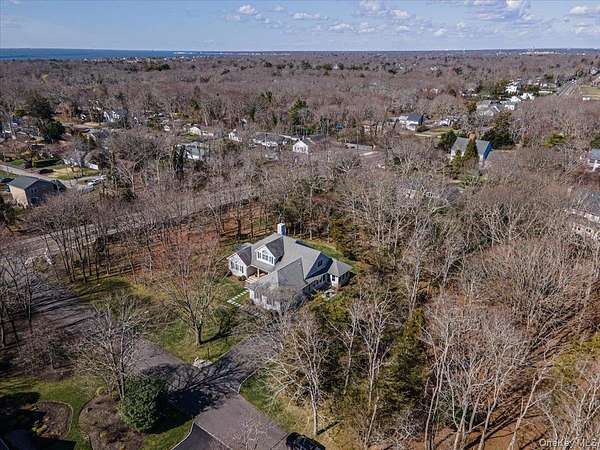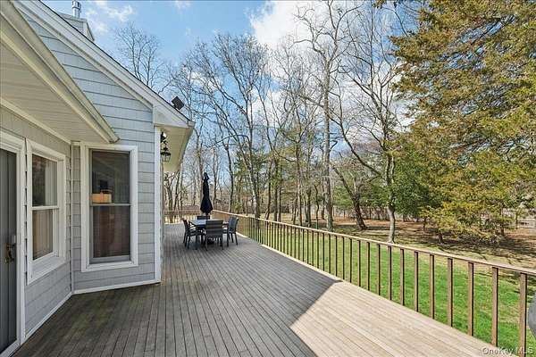 Tucked away within a private, secluded community off South Country Road, this post-modern beauty is situated on 1.57 landscaped acres. An impressive double-door entry opens to a formal entryway, setting the tone for the home's inviting and spacious layout. Inside, you'll find a sun-filled living room with a gas fireplace that flows seamlessly into the formal dining room and eat-in kitchen - the true centerpiece of the home. The kitchen features custom wood cabinetry with crown molding, granite countertops, and a large center island providing the perfect space for casual dining and entertaining. It is equipped with stainless steel appliances, including a gas cooktop with a vent hood, double wall ovens, and a built-in microwave. Recessed lighting and rich hardwood floors enhance the warm, inviting atmosphere. The open layout flows into the surrounding spaces, including a delightful three-season room-perfectly blending indoor and outdoor living. The first-floor primary bedroom features a full en-suite bath and double sliders leading to the expansive mahogany back deck. Also on the first floor is a second bedroom with access to its own full bath. Step outside to your own private retreat featuring a 50-foot mahogany deck, a charming front mahogany porch, a bluestone patio, and a fenced yard-offering the ultimate setting for relaxation and entertaining in complete privacy. Heading upstairs, the second-floor balcony-style hallway creates a dramatic and airy architectural feature that overlooks the main living area and enhances the home's open-concept design. The second floor offers two gracious bedrooms and an additional full bath. Additional highlights include a full 8ft basement, 2 car attached garage, central vacuum, 2-zone HVAC system, 200-amp electric, Andersen windows, vinyl siding with aluminum trim, and an 11-zone in-ground sprinkler system and a storage shed. Set within a quiet, private enclave, this exceptional property offers a rare opportunity to enjoy estate-like living with unmatched privacy, space, and versatility-all just moments from the water and both Bellport and Patchogue Village amenities.