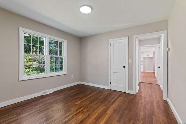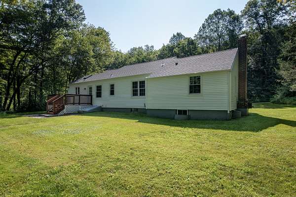 This spacious ranch style house has a new roof, new vinyl siding, some new windows and new deck plus covered front porch. Remodeled eat in kitchen has white shaker style cabinets with granite counter tops, hardwood flooring and stainless steel appliances. Living room has bay window, hardwood floors and fireplace. Two good size bedrooms plus two fully remodeled bathrooms. Formal dining room. There are two accesses from main level to full unfinished basement. House is heated with oil warm air heat. The well and driveway are new. House is situated on large two acre lot with good size back yard.