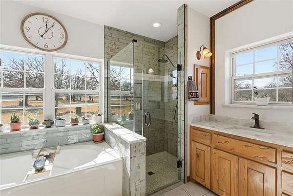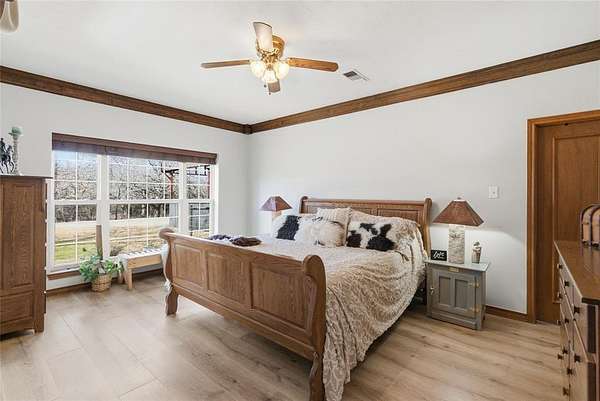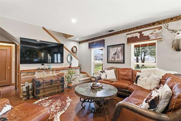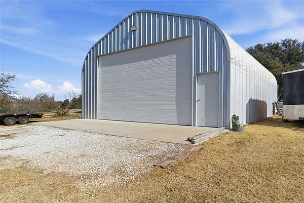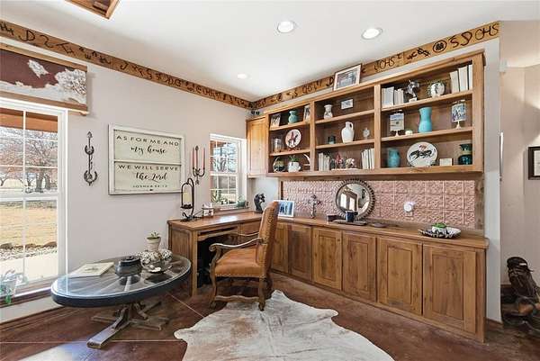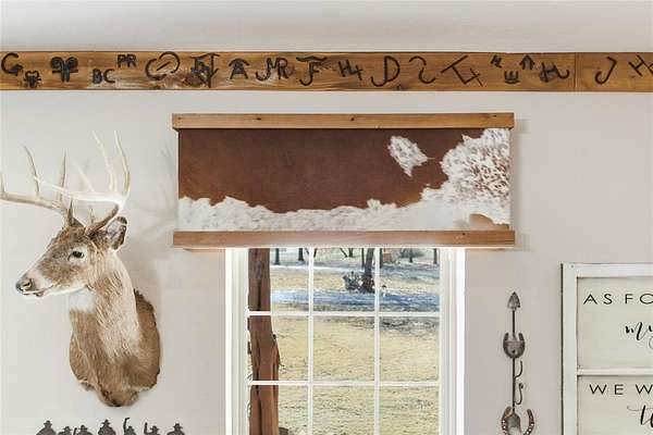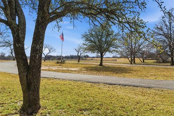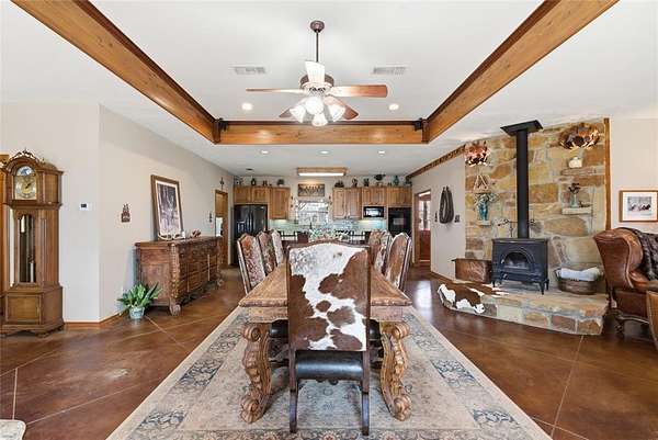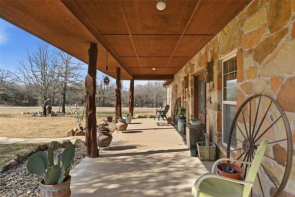 Set beyond a winding drive that meanders through rolling pastures, this breathtaking 40-acre ranch unfolds as a true Texas sanctuary. The custom stone ranch house is thoughtfully positioned to take in the land, wide-open skies, scattered mature trees, and the kind of quiet that lets you exhale the moment you arrive. The heart of the home is a stunning updated kitchen anchored by a massive taj mahal quartzite island & copper farmhouse sink, flowing seamlessly into a spacious dining area with a recessed ceiling & wood-burning stove. The living area & open office space continue creating a warm, connected layout filled with natural light. A generous game room offers flexible space for hobbies, fitness, or gatherings. The primary suite is a private retreat with a serene, spa-like bath & a custom closet featuring a private vanity. 2 guest rooms on the main level share a Hollywood bath, while a fourth bedroom upstairs functions beautifully as a secluded guest suite with its own ensuite bath. Throughout the home, custom western metal lighting, incredible custom cabinetry, fabulous wood doors, cowhide transoms, & branded trim add distinctive character & craftsmanship to this home. Incredible outdoor living area, with stone wood-burning fireplace, vaulted ceiling, & spa, overlooks the backyard & surrounding trees, creating a natural extension of the home and an ideal spot for morning coffee & evenings under the stars. The property is complete with a 30x50 insulated shop w electricity, great for parking all your toys! 2well houses w implement parking & storage. 2 stall shedrow. The older BarnMaster, currently used as a workshop & feed room, was once a 2nd residence as it features a kitchen & bath needing TLC. Wooded trails & the gorgeous stock tank invite exploration. Lush coastal Bermuda grass. Private, peaceful, & beautifully positioned, this remarkable ranch offers the best of country living, just 31 miles from downtown Fort Worth & 52 miles from DFW International Airport.