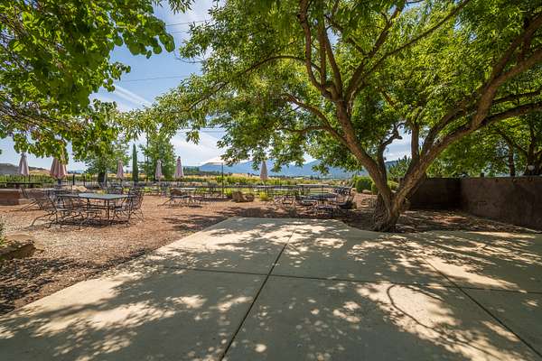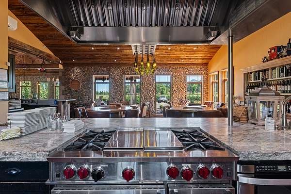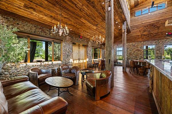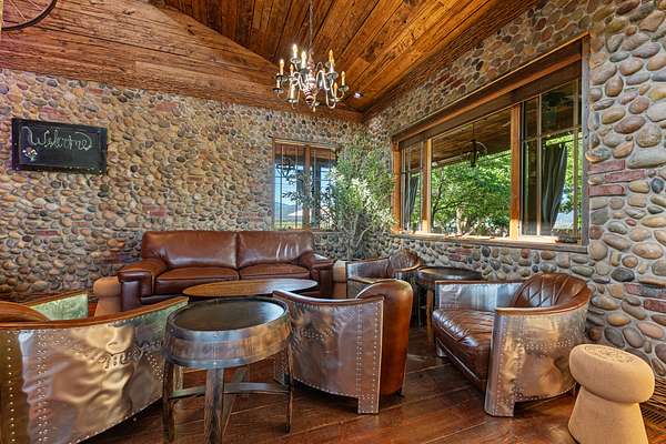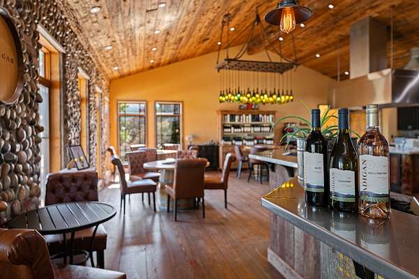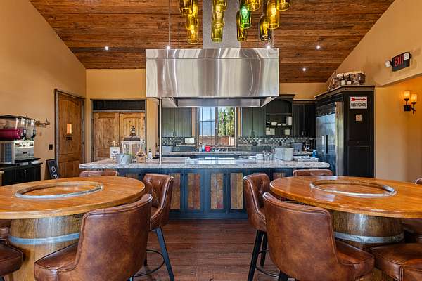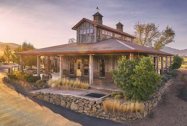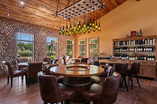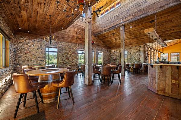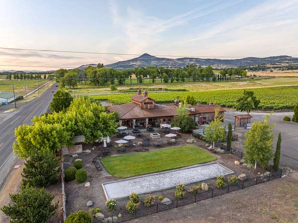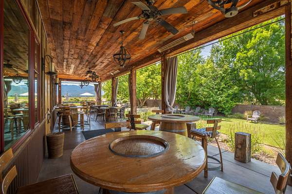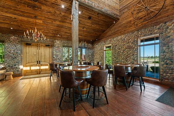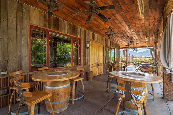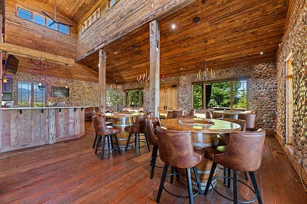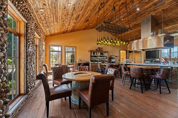 The 4,150-square-foot tasting room combines rustic elegance with functional design, featuring reclaimed Douglas Fir floors, vineyard-sourced river rock, clerestory ceilings, and artisan lighting. Hospitality infrastructure includes a chef's kitchen, prep kitchen, and a 1,633-square-foot covered patio with bocce court, firepits, ambient lighting, and space for up to 300 guests under cover. The facility is ADA accessible, fully landscaped, and ideal for both daily service and private events.