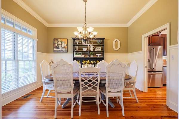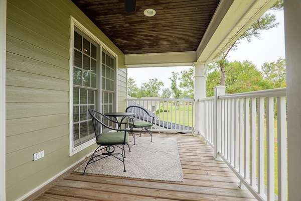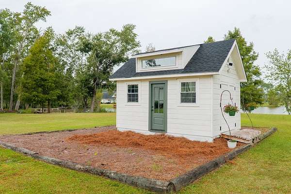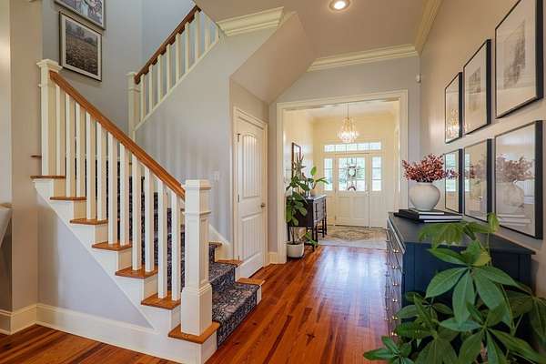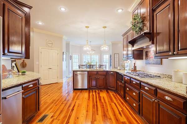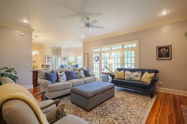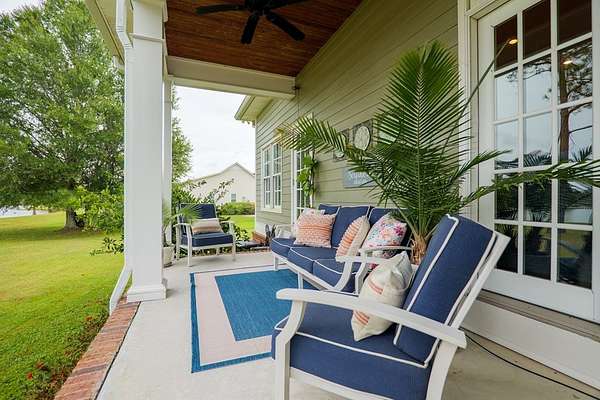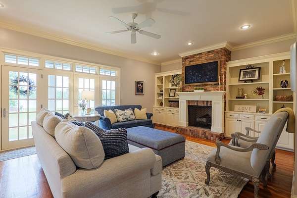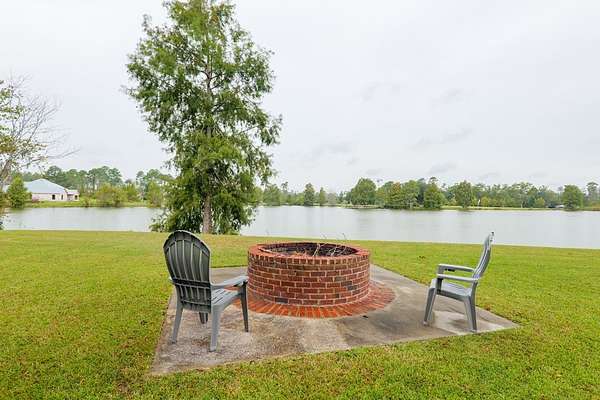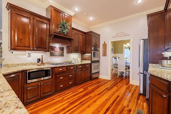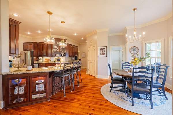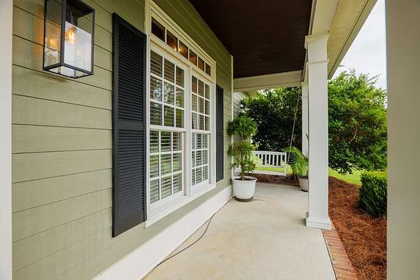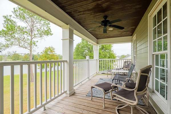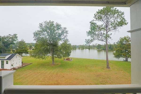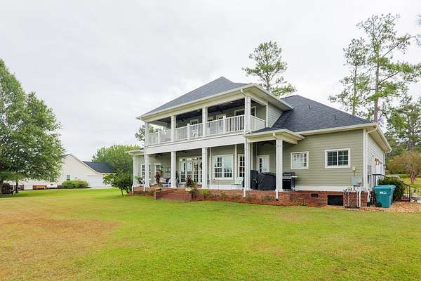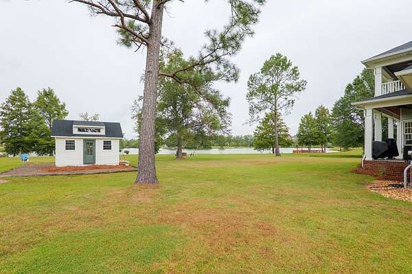 Custom waterfront home in McMullen Estates on 2.23 acres with mature trees and a private pond. This two-story home blends Southern architecture with modern function. Built in 2006, it offers 3,832 square feet with five bedrooms and three baths. The main level features heart-pine floors, a living area anchored by a fireplace, and a breakfast nook overlooking the property. The kitchen handles daily cooking and hosting with granite counters, generous cabinetry, a walk-in pantry, a gas cooktop, dishwasher, and a dedicated ice maker. The owner's suite sits on the main level with dual closets, a soaking tub, and a walk-in shower. An adjoining room serves as a bedroom, office, or nursery. Upstairs offers three bedrooms with walk-in closets, a large media room, and easy-access attic storage.Outdoor living includes a deep front porch, a covered back porch, and a second-story balcony with pond views. The property includes a separate workshop, thermopane windows, two tankless water heaters, cement siding, an architectural shingle roof, well water, and a septic system.
