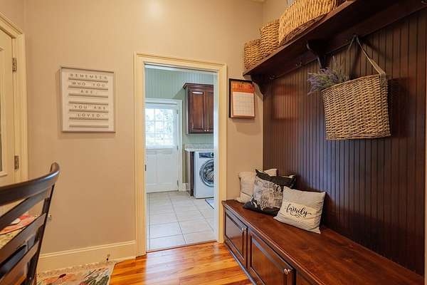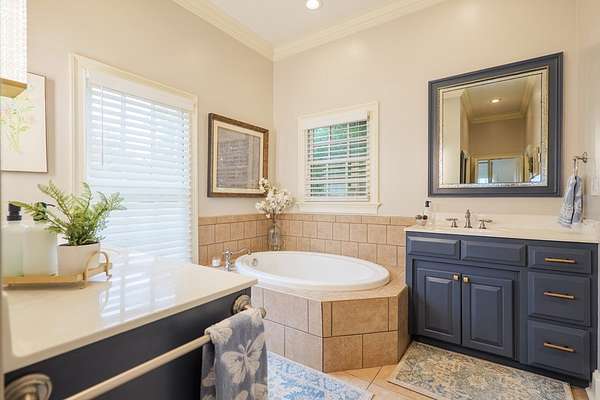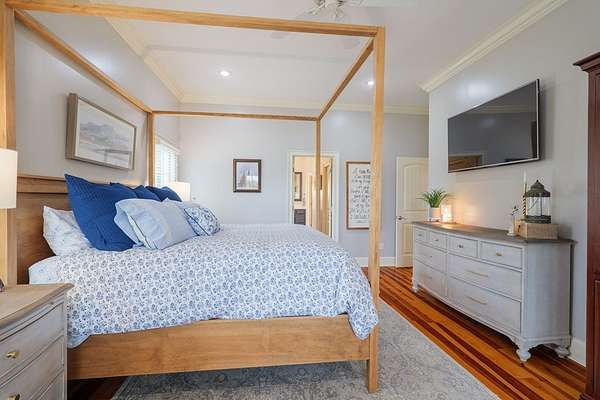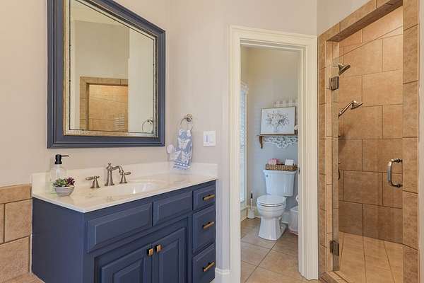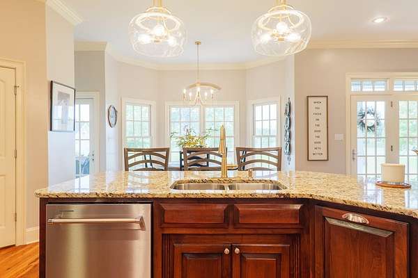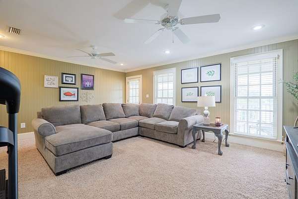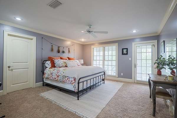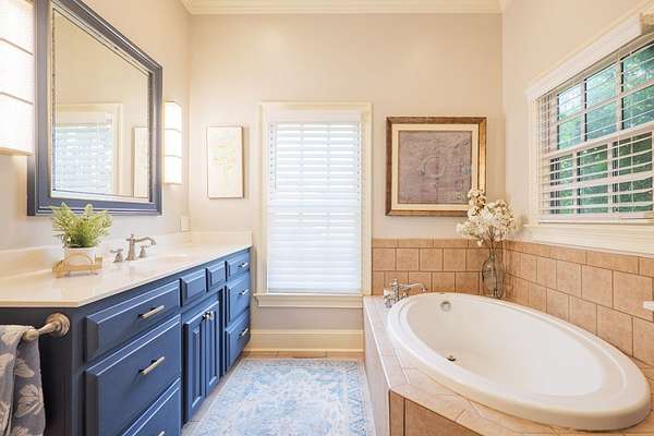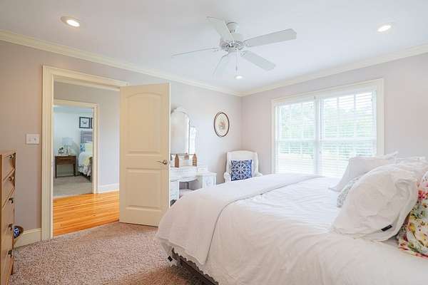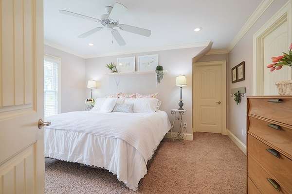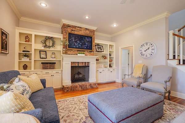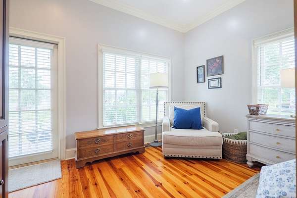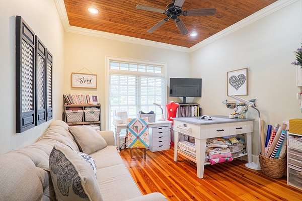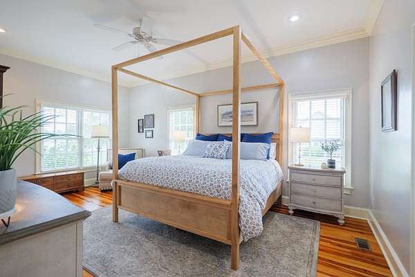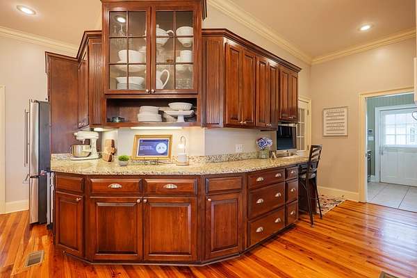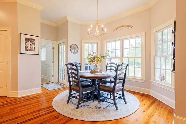 Custom waterfront home in McMullen Estates on 2.23 acres with mature trees and a private pond. This two-story home blends Southern architecture with modern function. Built in 2006, it offers 3,832 square feet with five bedrooms and three baths. The main level features heart-pine floors, a living area anchored by a fireplace, and a breakfast nook overlooking the property. The kitchen handles daily cooking and hosting with granite counters, generous cabinetry, a walk-in pantry, a gas cooktop, dishwasher, and a dedicated ice maker. The owner's suite sits on the main level with dual closets, a soaking tub, and a walk-in shower. An adjoining room serves as a bedroom, office, or nursery. Upstairs offers three bedrooms with walk-in closets, a large media room, and easy-access attic storage.Outdoor living includes a deep front porch, a covered back porch, and a second-story balcony with pond views. The property includes a separate workshop, thermopane windows, two tankless water heaters, cement siding, an architectural shingle roof, well water, and a septic system.