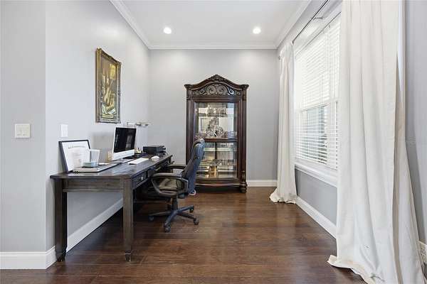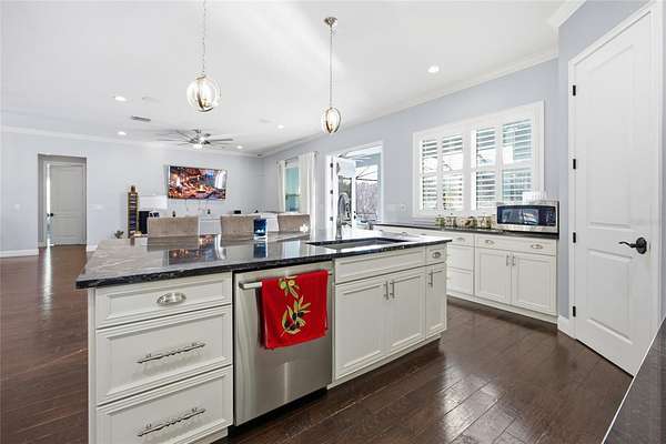 - Built-In Features, Ceiling Fans(s), Crown Molding, Eat-In Kitchen, High Ceilings, Open Floorplan, Primary Bedroom Main Floor, Thermostat, Window Treatments