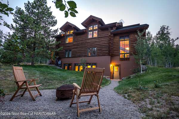 Located in lovely Hidden Hills, 15 minutes from the town of Wilson, this wonderful and private retreat offers a true feeling of sanctuary. Enjoy views of the valley from Munger Mountain to the Snake River, from this gracious 7.24 acre lot. This property is a 5 minute drive to Snake River access and Teton views for great fishing and swimming. The large lot allows for expansion and further development of the already charming main house. There are 2 bedrooms, a bunk room, and 2 and a half baths in this lovely log home featuring tongue and groove vaulted ceilings, granite counter tops, Wolf appliances, and custom kitchen cabinets. The primary bedroom includes an ensuite custom bathroom and access to the large balcony. An additional media room, office and 2 spacious garage bays are included