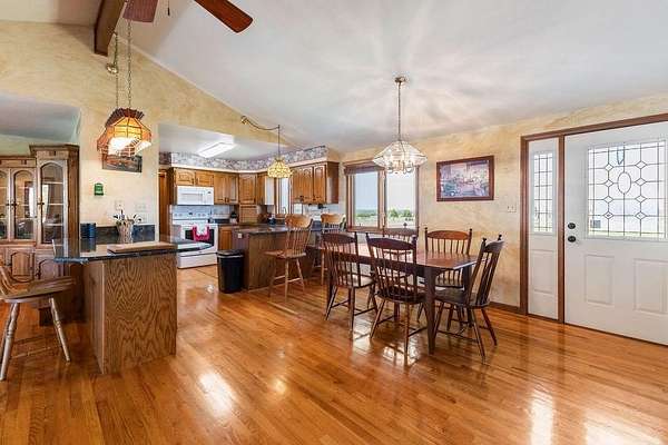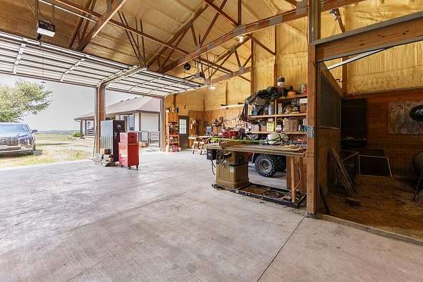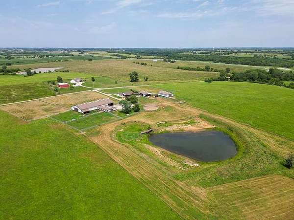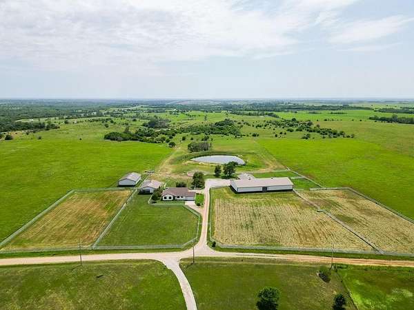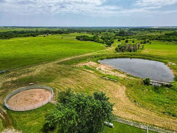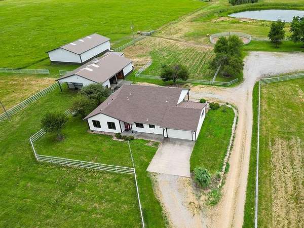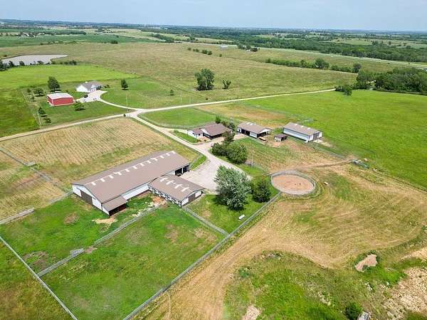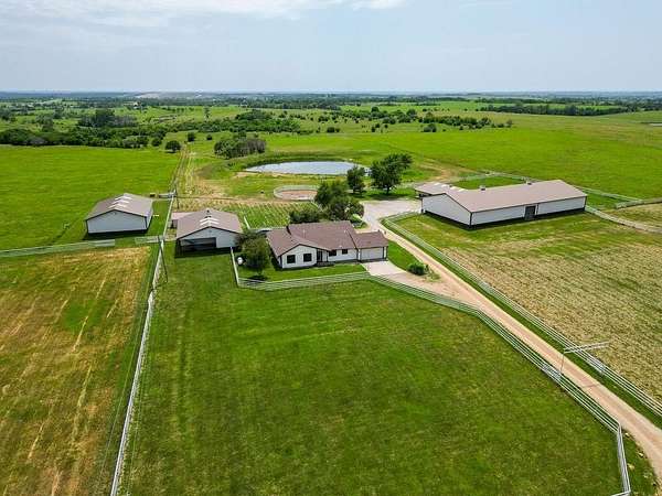 Horse Lovers Delight!!! 74 Acres MOL Just North of Topeka just off of 75 Highway and 94th Road. This property HAS IT ALL!! And unbelievable views from every side! Large pond just off the back of the home....perfect way to relax at the end of the day and throw a line in the water! This updated ranch home has a brand new roof as of July 2025 with gutters and downspouts. Beautiful home has tons of natural light in the open floor plan with vaulted ceilings, granite counters, mud room, tons of storage with the basement and a stunning covered porch! Hall bath is equipped with a walk in tub! All Morton Brand Buildings include: indoor riding arena, 7 stall heated barn, equipment storage, garage and pipe fencing. Stalls have auto waterers, swing out feeders. Horse barn has 7 matted stalls: 6-11.5 X 12 stalls and 1-11.5 X 14 stall, heated tack room, bathroom, hot/cold wash rack, 6" concrete alley, skylights, 9 ft sliding doors that open to the indoor riding arena! 60 X 40 building has a concrete floor with water and electricity and 1-13 X 13 stall. The shop has been recently spray foamed for added insulation. There is nothing to be desired here! Move right in and ENJOY your little slice of heaven!!