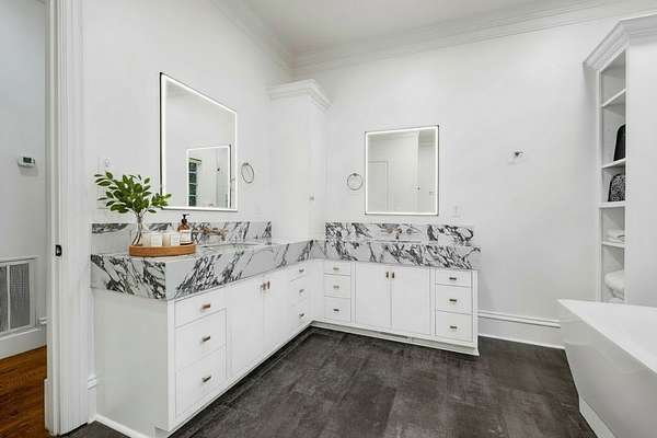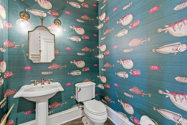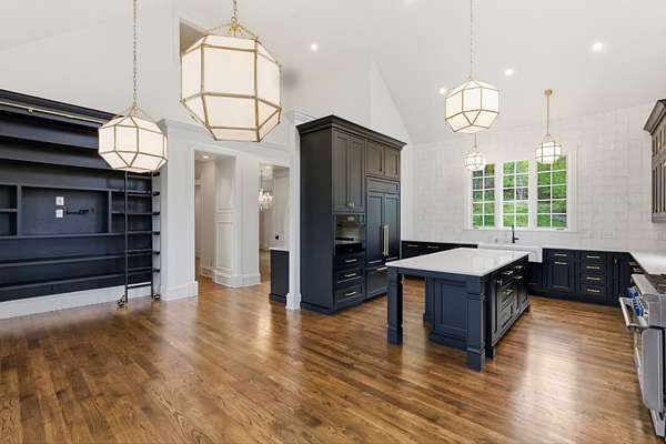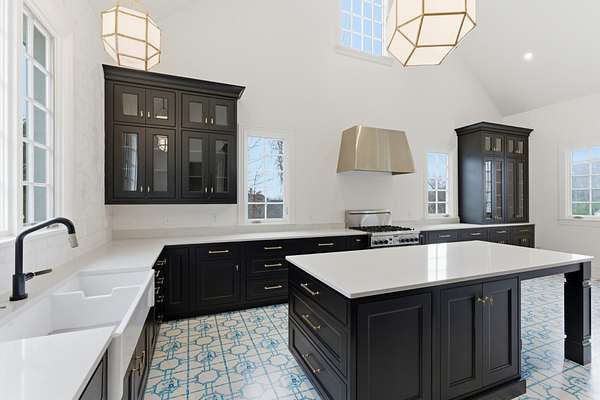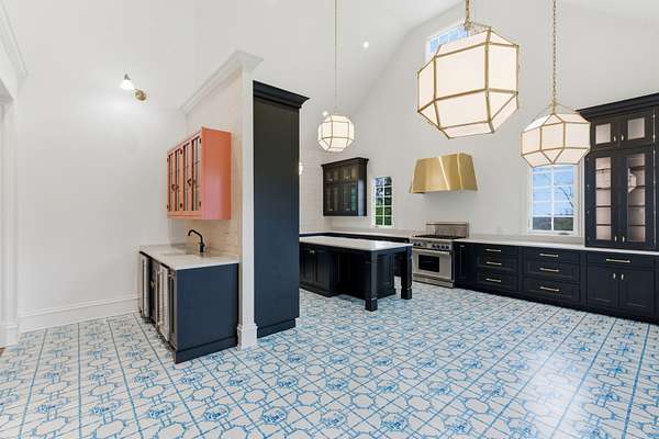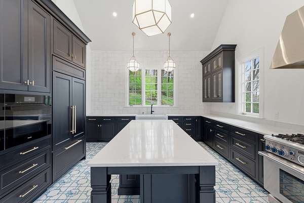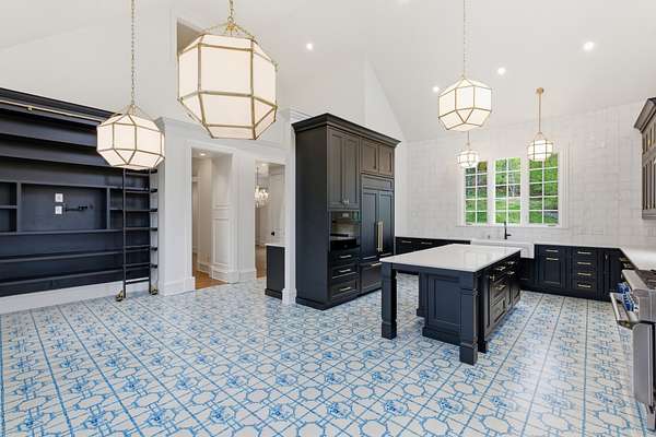 The show-stopping kitchen renovation (2020) boasts a one-of-a-kind commercial-grade hardwood tile floors was designed in collaboration with Madcap Cottage, quartz countertops, hand-tumbled backsplash, and premium appliances: a Miele convection/steam oven, Miele dishwasher, Thermador 6-burner gas range, and Subzero refrigerator/freezer. A wet bar with refrigerator and ice maker, plus a walk-in pantry with a dumbwaiter from the garage, adds both luxury and convenience.