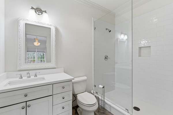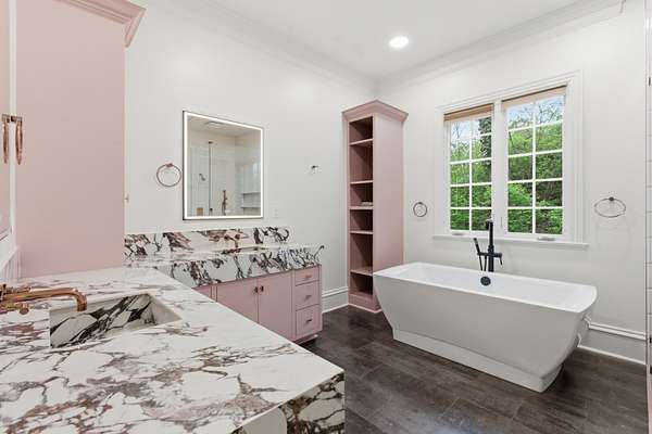 Inside, you’ll find five ensuite bedrooms, including a main-level primary suite with a bath that was renovated in 2023 featuring heated floors, a Toto electric toilet, flush-entry shower, tub and lighted medicine cabinet mirrors.