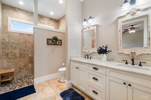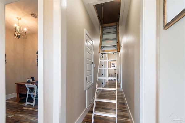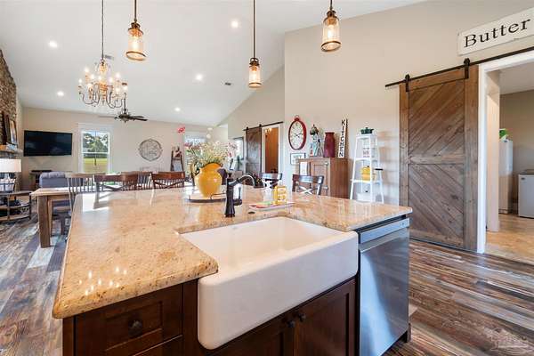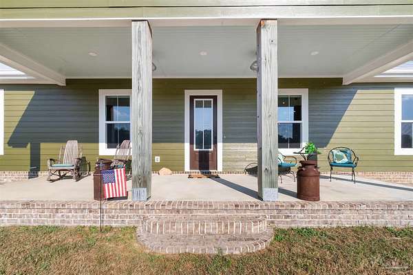 Introducing Dream Acres, a hidden gem located in the tranquil countryside of Molino, embraced by picturesque equestrian estates, the Perdido River WMA, and safeguarded agricultural lands. Access your own secluded retreat via a private road that meanders through the stunning agricultural scenery of Northwest Florida. Built in 2017, this custom-designed farmhouse showcases a thoughtful layout that combines style and functionality. Step onto the inviting front covered porch or the expansive 10 x 60-foot covered back porch, both offering breathtaking views of the surrounding countryside. Inside, the home greets you with soaring vaulted ceilings, charming stone-accented wood-burning fireplace, and elegant rustic luxury vinyl plank flooring throughout. The kitchen is a true culinary delight, boasting a generous 6' x 7' island, high-end appliances, Wolf gas cooktop and hood, granite countertops, and custom wood cabinetry crafted by local Mennonites. Down the hallway there's two spacious bedrooms with ample closet space, and a guest bathroom. The primary suite offers an extra large closet, a luxurious walk-in shower, double vanity. All accented by remarkable high ceilings and custom solid wood slider doors throughout. Additionally, the attic provides extra storage and finished square footage. Equipped with a full-house dehumidifier and high-impact windows enhance comfort and safety. Encompassing just over 20 acres (10 acres of raw land, along with 5 acres dedicated to a lush yard and 5 acres of pasture previously utilized for cattle grazing) with a spacious barn for all your equipment, a covered feed station with the potential for a stable/barn conversion, and a chicken coop. Water is sourced from a deep well. As you stroll to the rear of the property, a serene spring-fed creek flows through, adding to the charm of this unique estate. With limitless possibilities for a hobby ranch or homesteading dreams, this property truly stands out as a one-of-a-kind opportunity.