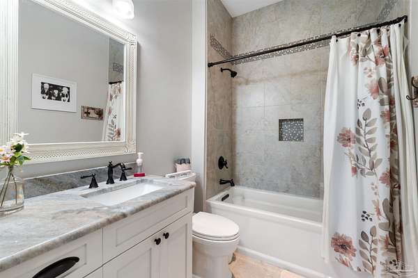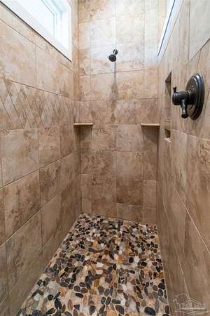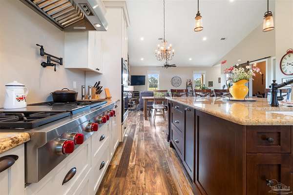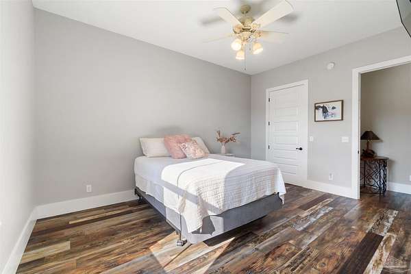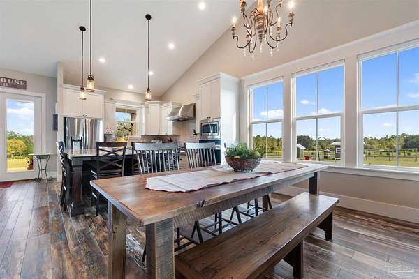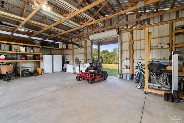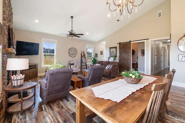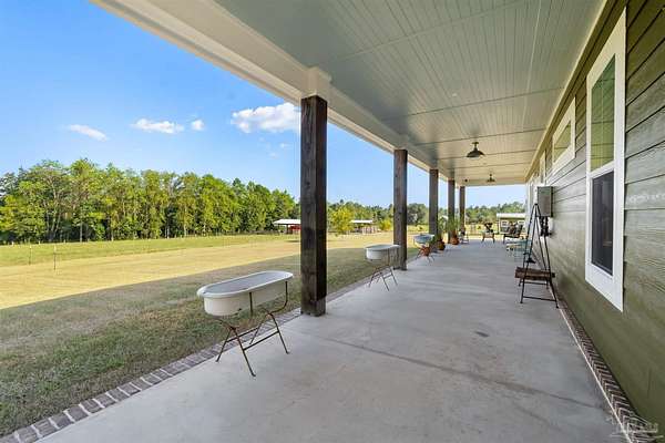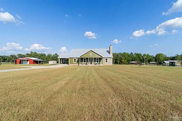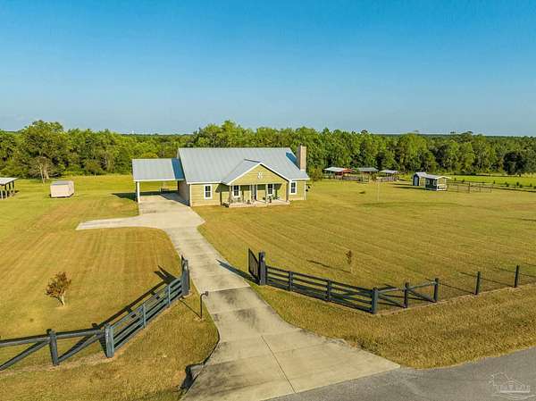Introducing Dream Acres, located in the tranquil countryside of Molino, embraced by picturesque equestrian estates, the Perdido River WMA, and safeguarded agricultural lands. Access your own secluded retreat via a private road that meanders through the stunning agricultural scenery of Northwest Florida. (The HOA is only to manage private road, not the properties). Built in 2017, this custom-designed farmhouse showcases a thoughtful layout that combines style and functionality. Step onto the inviting front covered porch or the expansive 10 x 60-foot covered back porch, both offering breathtaking views of the surrounding countryside. Inside, you're greeted with soaring vaulted ceilings, stone-accented wood-burning fireplace, and rustic luxury vinyl plank flooring throughout. The kitchen is a true culinary delight, boasting a generous 6' x 7' island, high-end appliances, Wolf gas cooktop and hood, granite countertops, and custom wood cabinetry crafted by local Mennonites. Down the hallway there's two spacious bedrooms with ample closet space, and a guest bathroom. The primary suite offers an extra large closet, a luxurious walk-in shower, double vanity. All accented by remarkable high ceilings and custom solid wood slider doors throughout. Additionally, the attic provides extra storage and finished square footage. Equipped with a full-house dehumidifier and high-impact windows enhance comfort and safety. Encompassing just over 20 acres (10 acres of raw land, along with 5 acres dedicated to a lush yard and 5 acres of pasture previously utilized for cattle grazing) with a spacious barn for all your equipment, a covered feed station with the potential for a stable/barn conversion, and a chicken coop. Water is sourced from a deep well. As you stroll to the rear of the property, a serene spring-fed creek flows through this unique estate. With limitless possibilities for a hobby ranch or homesteading dreams, this property truly stands out as a one-of-a-kind opportunity.