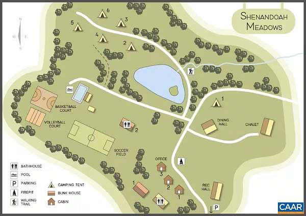 Nestled on 40 breathtaking acres in Fort Valley, Virginia, Camp Shenandoah Meadows is a spectacular retreat perched between the North and South Forks of the Shenandoah Rivers. This spectacular retreat offers stunning panoramic mountain and water views to the East and West. Ideally situated 90 minutes from Washington DC and just 30 minutes from Shenandoah National Park. The expansive grounds can host 200 guests featuring a separate boys and girls bunkhouse, 3 level Chalet, commercial-grade dining hall, 3 A-frame tiny cabins, bath house, 1,482 sq. ft. recreation hall, 60'x30' swimming pool with pool house, large soccer field, full sized basketball court, large fishing pond, outdoor fire pit, 6 campsites with approval for up to 15 possible sites. Offering countless outdoor activities and a connection to nature unparalleled in Virginia. The property is located in the middle of some of the best hiking, rock climbing, fishing, rafting and mountain biking the Shenandoah Valley has to offer. Numerous area hikes are located within 20 minutes of the property including: Kennedy's Peak Hike and Signal Knob reservoir hike, among others!