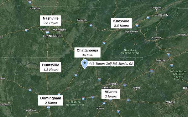 From Downtown Chattanooga: Take US 27S to I-24W toward Nashville/Birmingham. Take left 2 lanes toward Birmingham. Continue on I-59 for approx. 8 miles. Take Exit 11 for GA 136 toward Trenton. Left on GA 157 S, Right on Old State Hwy. Right onto Tatum Gulf Road. Home will be on the left.