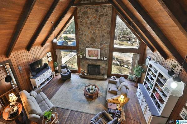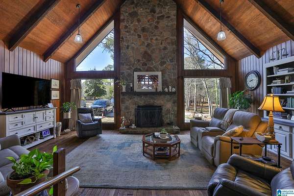 An extraordinary cedar estate set on 14+- breathtaking acres, complete with 2 serene ponds, a sparkling saltwater pool, and striking architectural character blended seamlessly with modern updates. Step inside to a formal dining room and a sunken living room anchored by a dramatic stacked-stone fireplace. Vaulted ceilings with exposed wooden beams and expansive floor-to-ceiling windows flood the home with natural light. Rich hardwood floors flow throughout the main level. The kitchen shines with new quartz countertops, while the main-level bathrooms have been fully remodeled with style and functionality. 2 spacious bedrooms share a charming Jack-and-Jill bath, and the oversized primary suite offers a spa-like retreat with generous space to unwind. A loft overlooking the living area provides ideal flex space. The daylight walk-out basement expands your living options with a den, full BA, kitchenette, and a large workshop. Recent upgrades: decks, windows, gutters, lighting, and more!