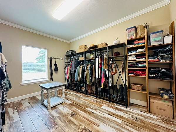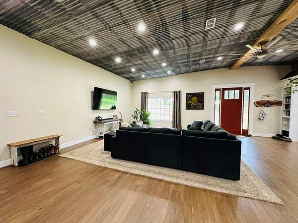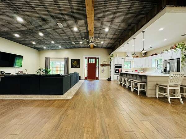 Turnkey homestead! Nestled on 25.95 acres this property features a large pond, year round creek and is just 3 miles from the Sabine river. ATV and walking trails have been carved into the pine and hardwood forests throughout the property. The modern barndominium competed in 2020 offers open living with ample space. A well designed custom home that boasts a chef's dream kitchen, quartz countertops and an island that seats seven, ceramic flooring throughout! Enjoy 20x60 attached covered parking, a deep well with pump just replaced July 2025 and 2x 200amp services. Full 50amp RV hookup behind the home and an additional 12x35 covered RV setup with 50amp power and its own septic tank. Attached is a 24x25 covered picnic slab. Whether you're seeking a peaceful retreat or ready to expand this East Texas gem has it all! This is a truly special property with too many features to list! Call for your viewing today!